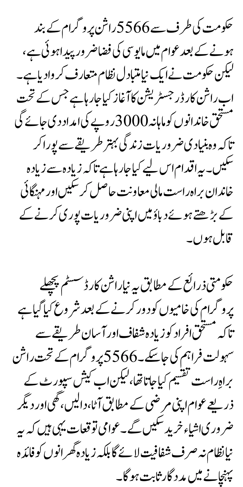 According to government sources, this new ration card system has been launched after removing the shortcomings of the previous program so that the deserving people can be facilitated in a more transparent and easy way Under the 5566 program ration was distributed directly, but now through cash support the people will be able to buy flour pulses, ghee and other essential items as per their wish Public expectations are that this new system will not only bring transparency but will also be helpful in benefiting more families.