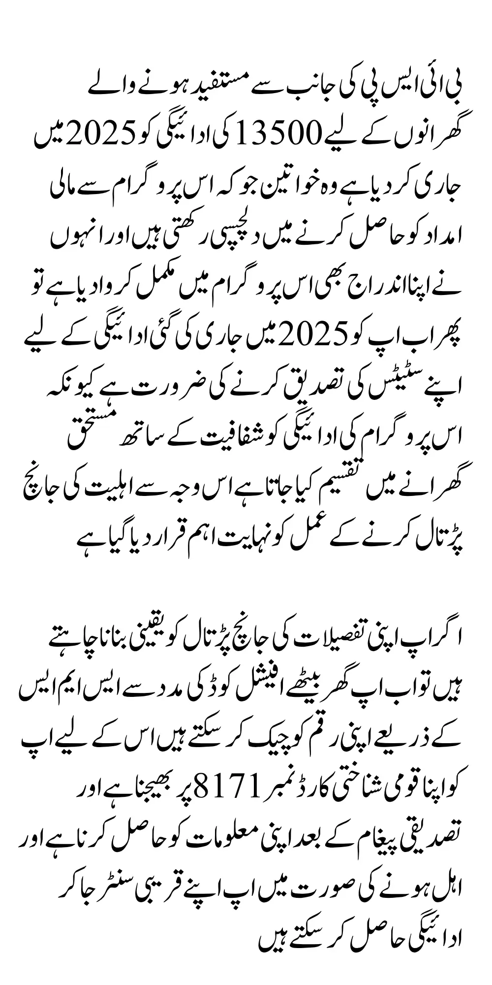 BISP has released a payment of 13500 in 2025 for the beneficiary families Those women who are interested in getting financial assistance from this program and have also completed their registration in this program then now you need to verify your status for the payment released in 2025 because the payment of this program is distributed to the eligible families with transparency therefore the process of checking the eligibility has been considered very important.