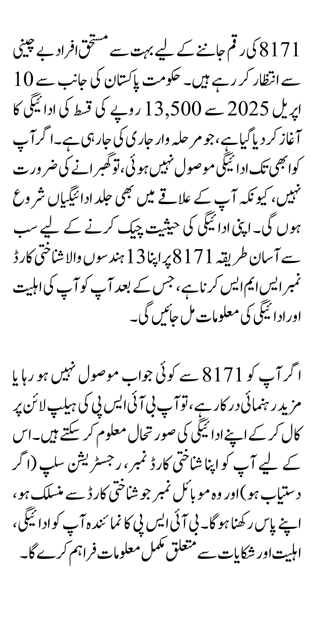 Many deserving people are waiting anxiously to know the 8171 Benazir Program April 2025 Payment Status. The Government of Pakistan has started the payment of Rs. 13,500 installments from April 10, 2025, which is being released in phases. If you have not received the payment yet, then there is no need to panic, as payments will start soon in your area too. The easiest way to check your payment status is to SMS your 13-digit CNIC number to 8171, after which you will get your eligibility and payment information.