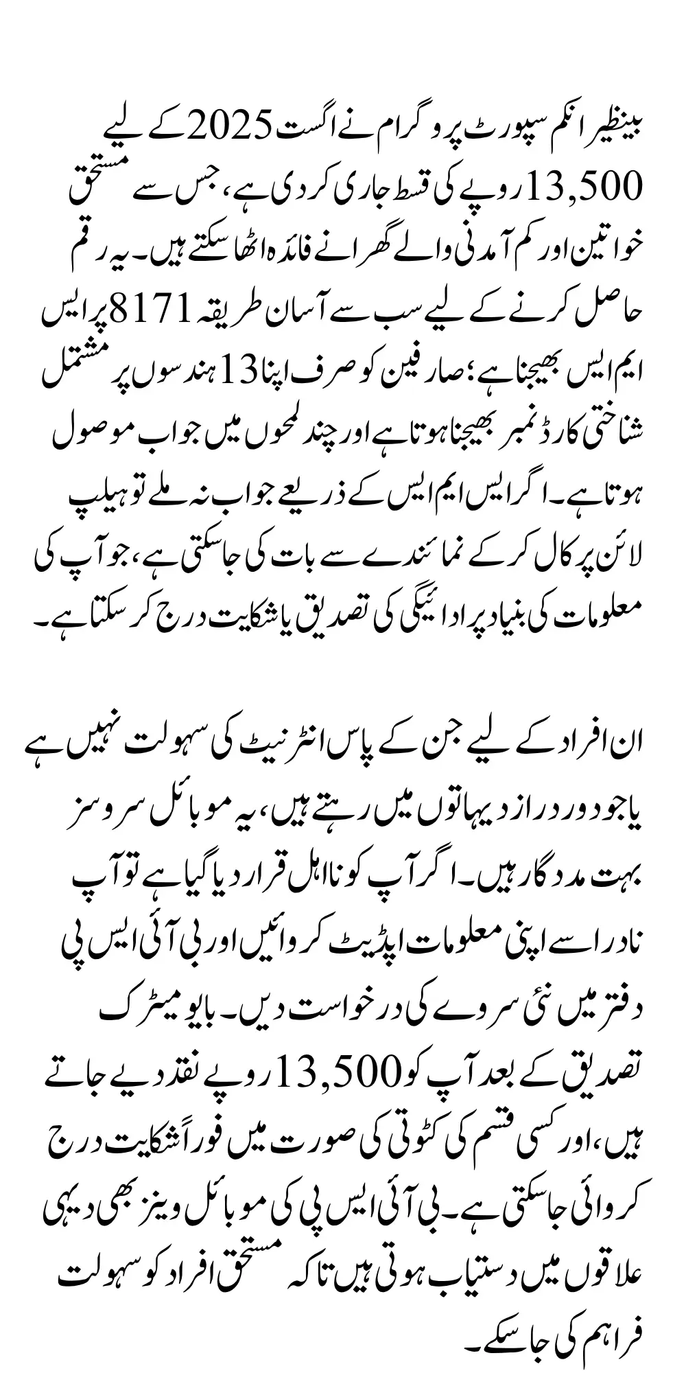 To use this service, open your messaging app and type your 13-digit CNIC number (without spaces or dashes). Send it to 8171, and within seconds or minutes, you will receive an automated reply. This message will inform you whether you are eligible for the payment and whether the Rs. 13,500 has been approved for disbursement.