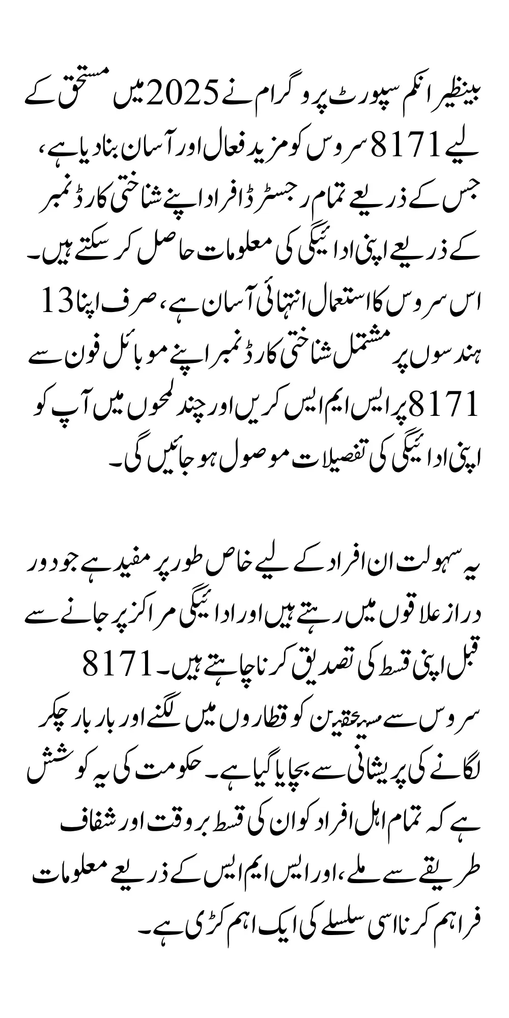 who live in remote areas and want to verify their installment before visiting the payment centers The 8171 service has saved the beneficiaries from the hassle of standing in queues and making repeated rounds It is the government’s effort to ensure that all eligible individuals receive their installment in a timely and transparent manner and providing information through SMS is an important link in this chain.
