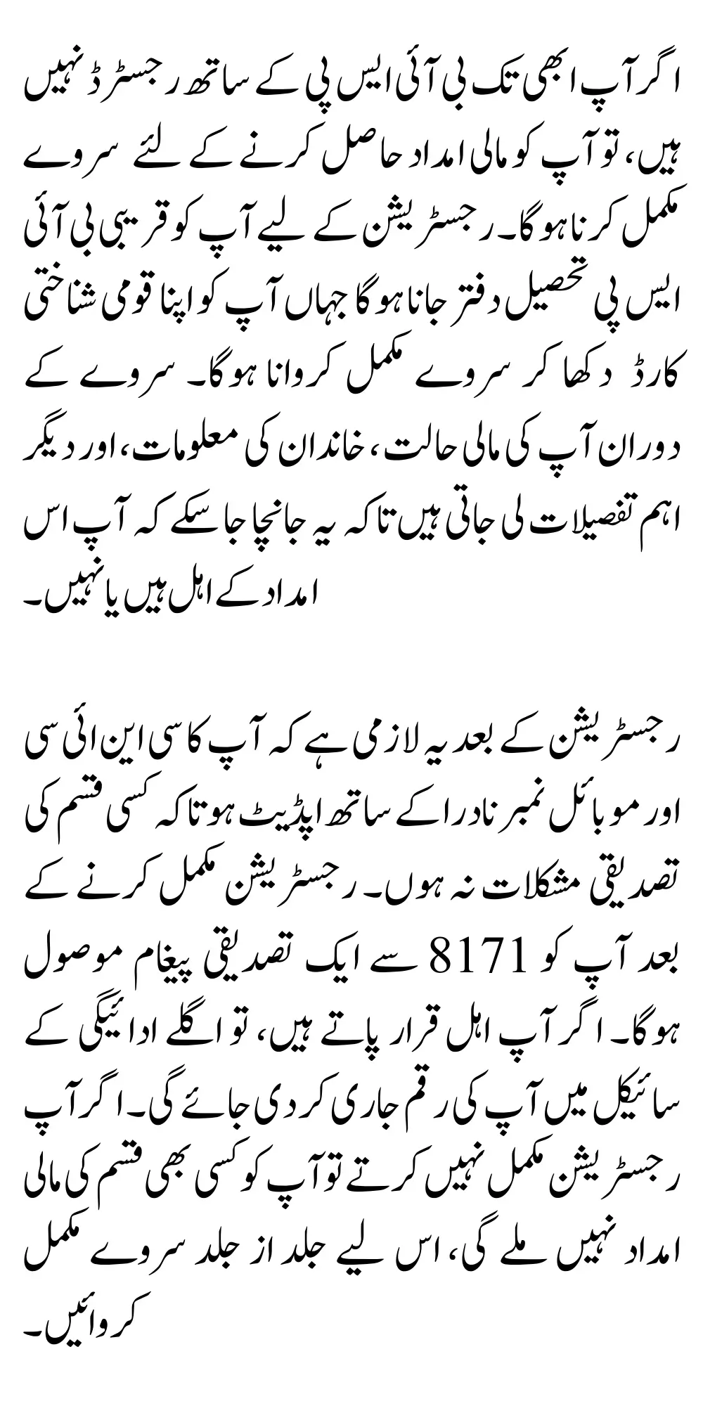 After registration, it is mandatory that your CNIC and mobile number are updated with NADRA to avoid any verification issues. After completing the registration, you will receive a confirmation message from 8171. If you are found eligible, your amount will be released in the next payment cycle. If you do not complete the registration, you will not get any financial assistance, so complete the survey as soon as possible.ster before 2025, you may not be eligible for the upcoming Rs. 13,500 quarterly payments.