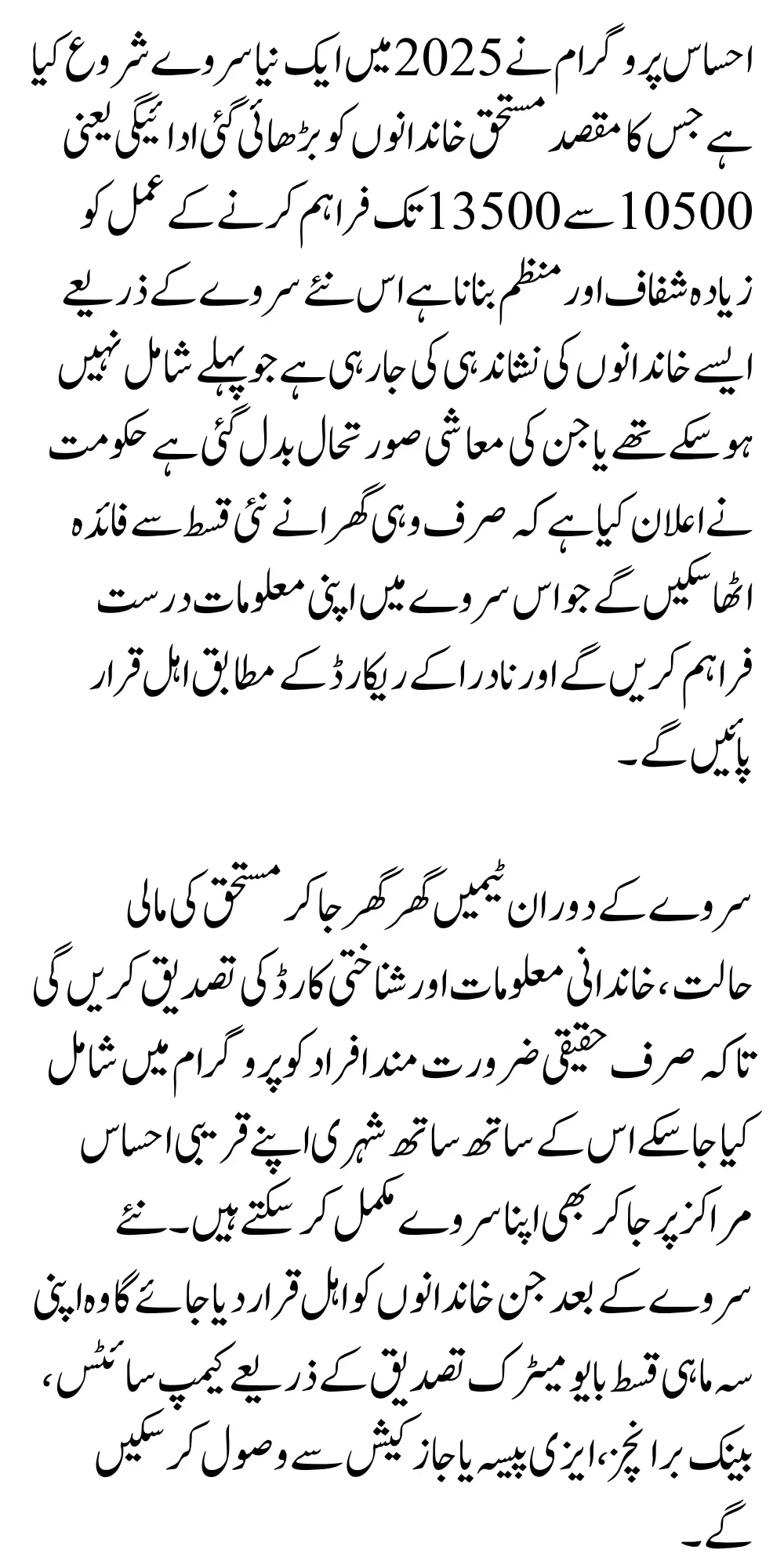 During the survey teams will go door to door to verify the financial statusn family information and identity card of the eligible so that only the truly needy people can be included in the program Along with this citizens can also complete their survey by visiting their nearest Ehsaas centers After the new survey the families who will be declared eligible will be able to receive their quarterly installment through biometric verification from campsites bank branches Easypaisa or Jazz Cash.