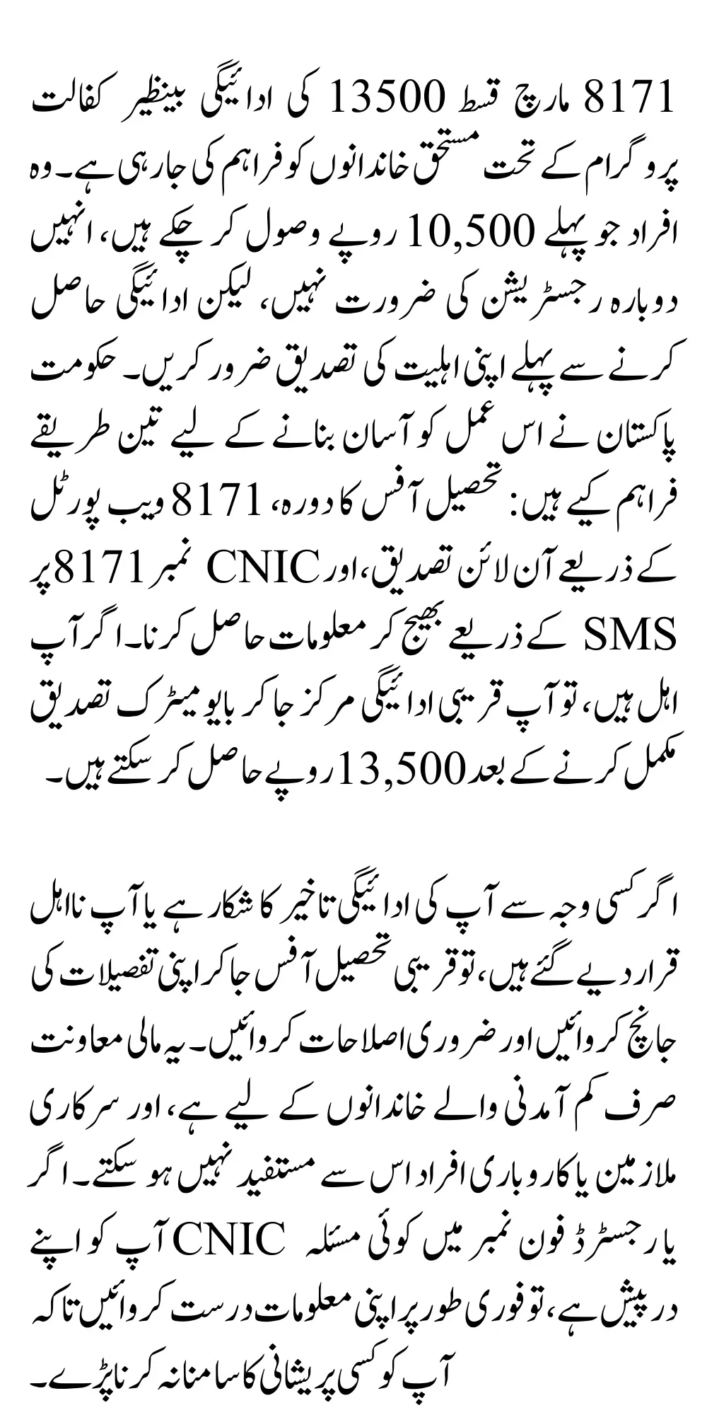 8171 Qist 13500 Payment For Benazir Kafalat is being provided to eligible families under the Benazir Kafalat Program individuals who have previously received Rs. 10,500 do not need to re-register, but must verify their eligibility before receiving the payment. The Government of Pakistan has provided three methods to facilitate this process: visiting the Tehsil Office, online verification through the 8171 web portal, and getting information by sending an SMS with the CNIC number to 8171. If you are eligible, you can receive Rs. 13,500 by visiting the nearest payment center and completing biometric verification.
