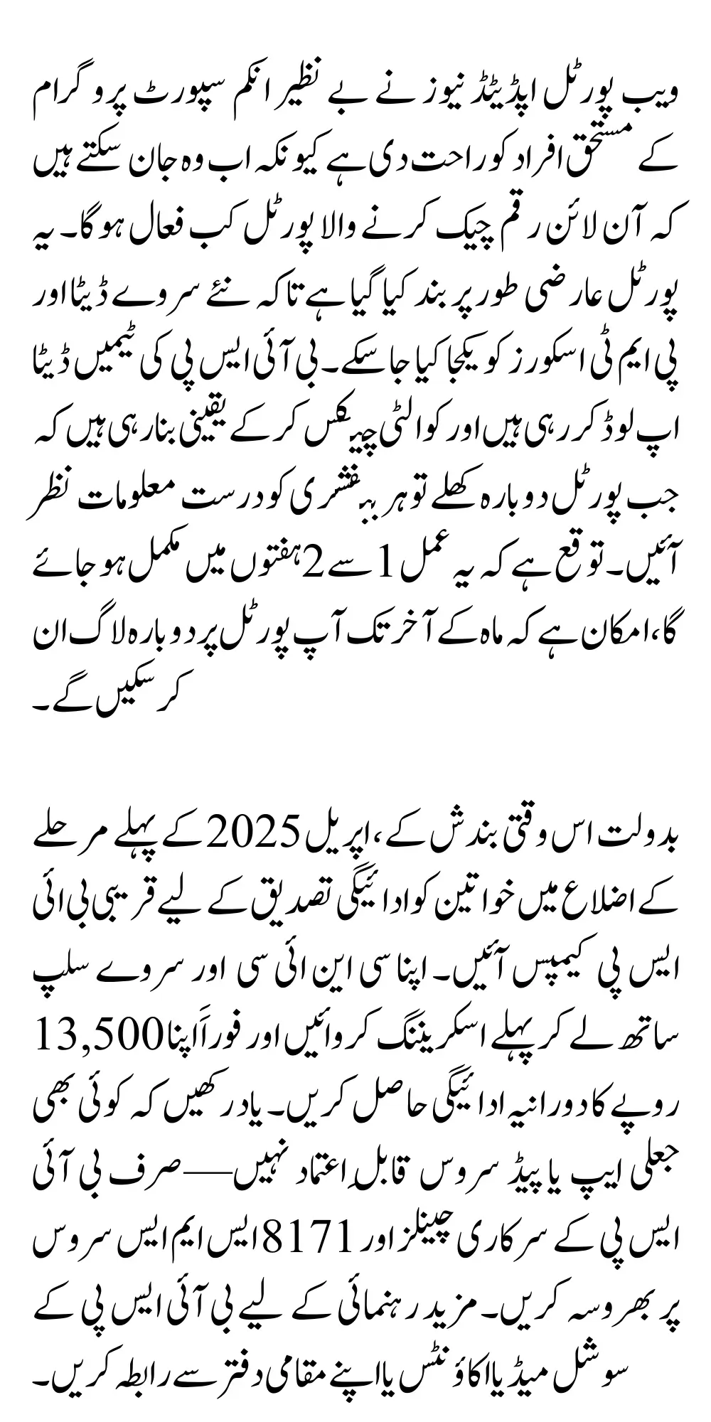 Due to this temporary closure, women in the districts of the first phase of April 2025 have to visit the nearest BISP campus for payment verification. Get your CNIC and survey slips ready for screening and get your periodical payment of Rs. 13,500 immediately. Remember that no fake apps or paid services are trustworthy—rely only on BISP’s official channels and 8171 SMS service. For further guidance, contact BISP’s social media accounts or your local office.