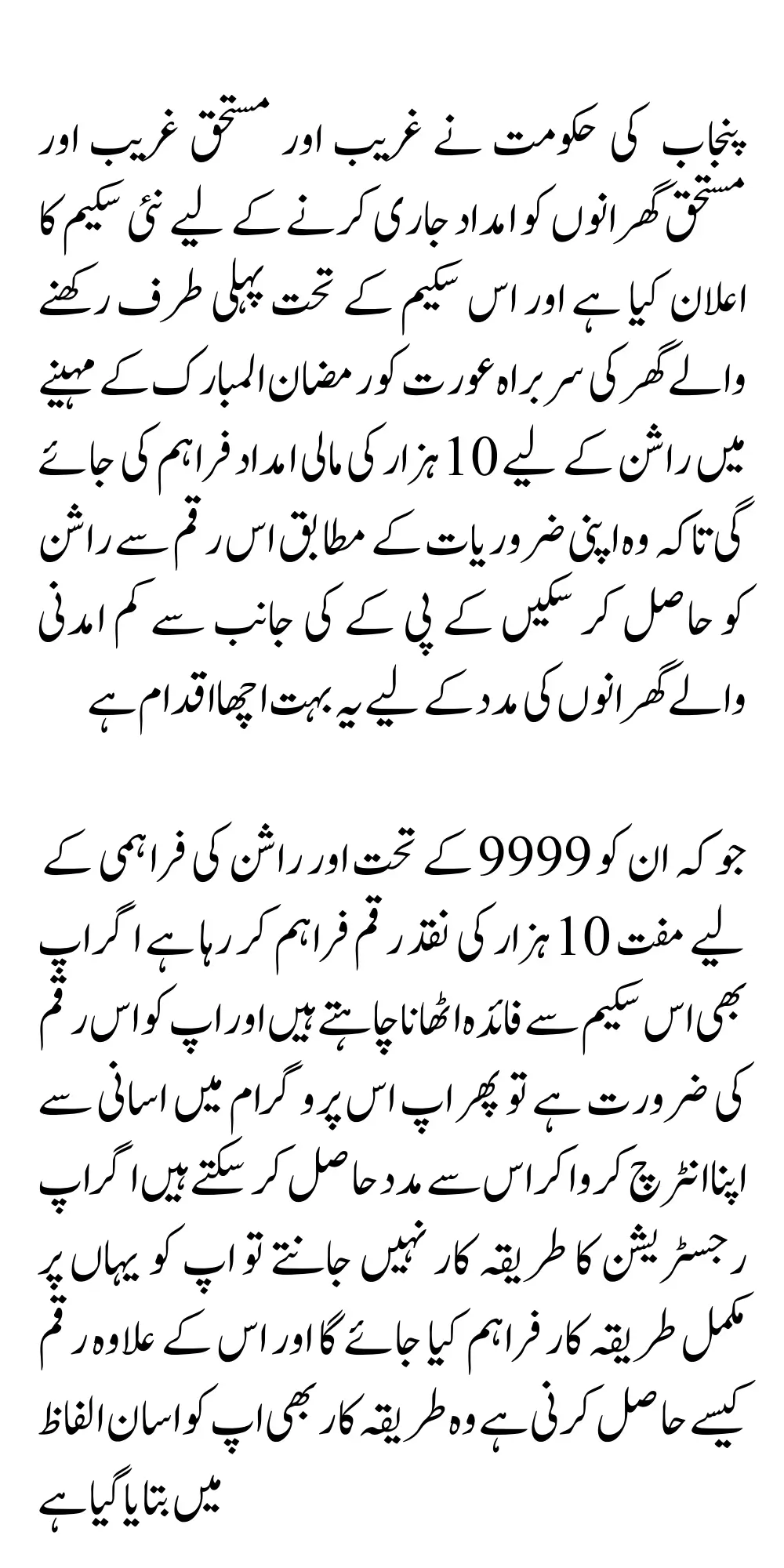 This is an initiative by the Punjab government to provide financial funds to reduce the burden of low-income families, which is releasing 10 thousand assistance to them during the holy month of Ramadan. Through the previous survey, poor families had to face many difficulties in getting ration and they had to stand in long queues to get ration,