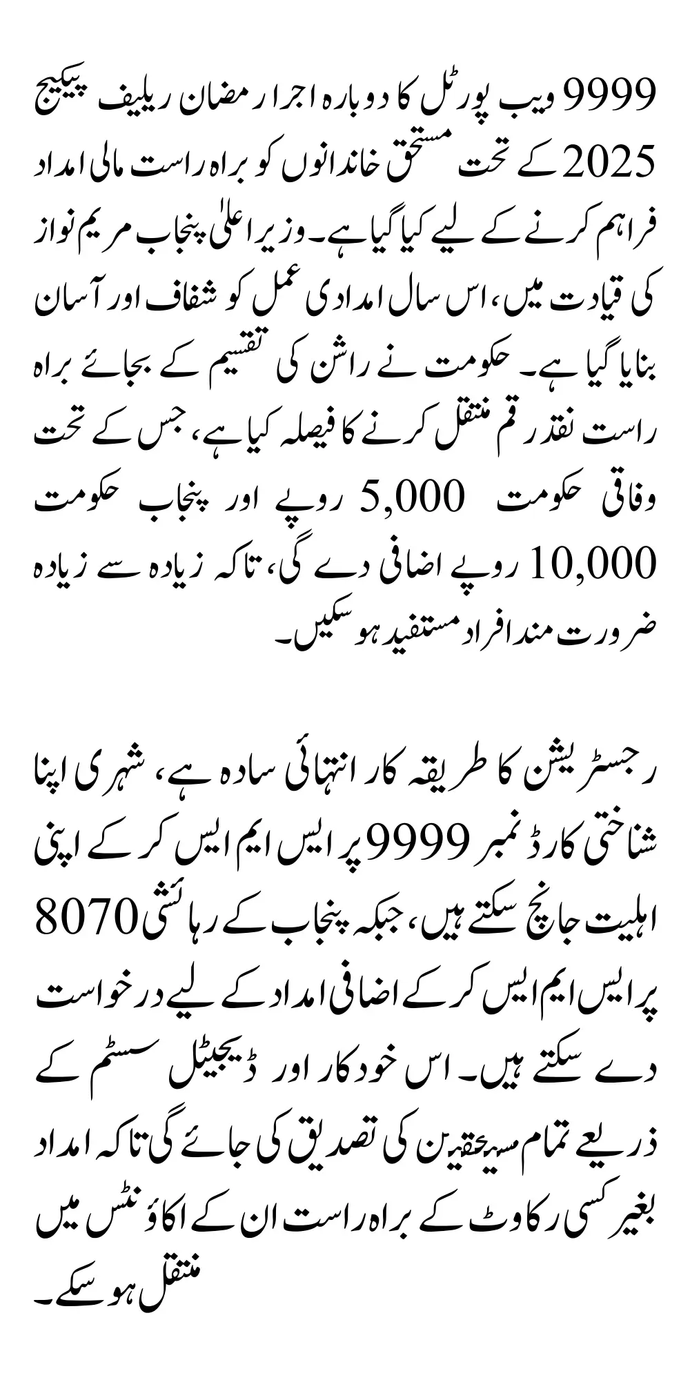 There is no need to visit any government office for registration in this relief package, but citizens can check their eligibility by sending an SMS to their CNIC number on 9999 deserving citizens of Punjab have also been given the facility to send an SMS to 8070 for additional financial assistance has paid special attention to making the entire process completely transparent through a digital system and Nadra verification, so that the assistance is provided only to those who are truly deserving.