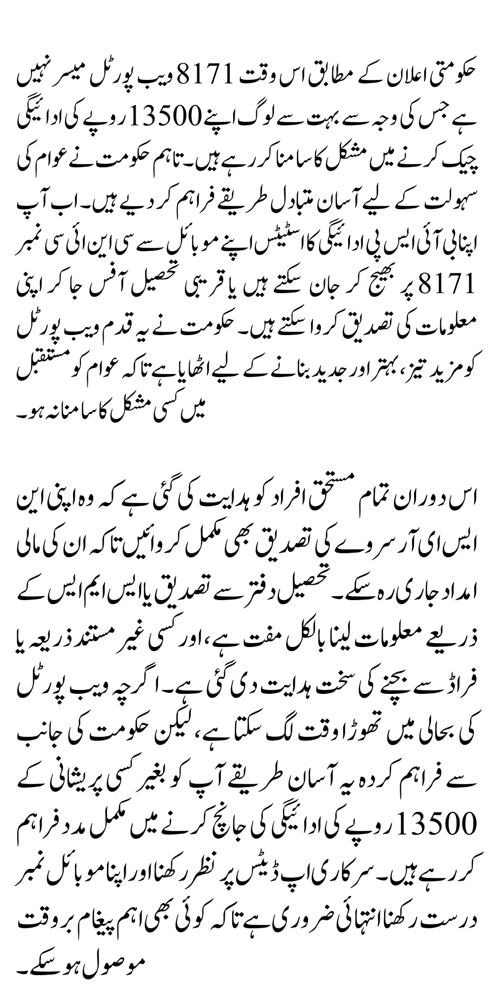 حکومتی اعلان کے مطابق اس وقت 8171 ویب پورٹل میسر نہیں ہے جس کی وجہ سے بہت سے لوگ اپنے 13500 روپے کی ادائیگی چیک کرنے میں مشکل کا سامنا کر رہے ہیں۔ تاہم حکومت نے عوام کی سہولت کے لیے آسان متبادل طریقے فراہم کر دیے ہیں۔ اب آپ اپنا بی آئی ایس پی ادائیگی کا اسٹیٹس اپنے موبائل سے سی این ائی سی نمبر 8171 پر بھیج کر جان سکتے ہیں یا قریبی تحصیل آفس جا کر اپنی معلومات کی تصدیق کروا سکتے ہیں۔ حکومت نے یہ قدم ویب پورٹل کو مزید تیز، بہتر اور جدید بنانے کے لیے اٹھایا ہے تاکہ عوام کو مستقبل میں کسی مشکل کا سامنا نہ ہو۔