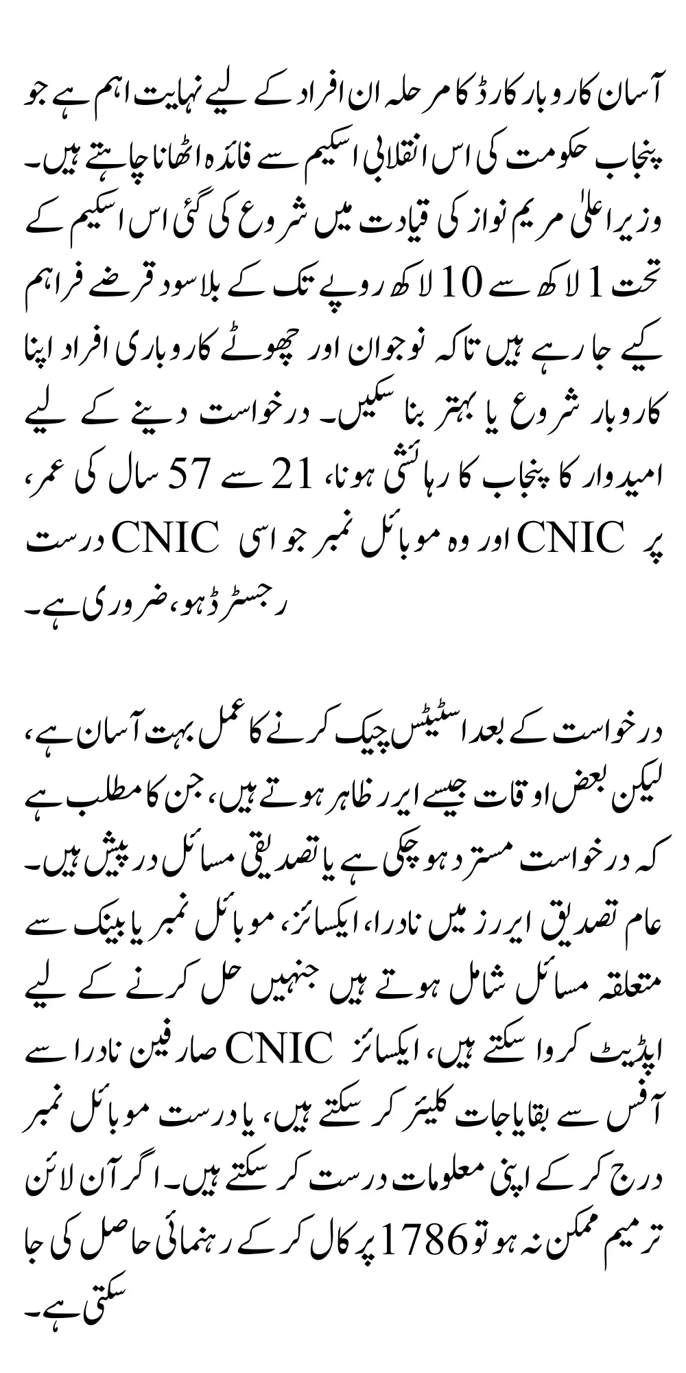CM Scheme Assan Karobar Card Identification stage is very important for those who want to benefit from this revolutionary scheme of the Punjab government Launched under the leadership of Chief Minister Maryam Nawaz, interest-free loans of Rs 1 lakh to Rs 1 million are being provided under this scheme so that young and small entrepreneurs can start or improve their businesses. To apply, the candidate must be a resident of Punjab, between the ages of 21 and 57, have a valid CNIC and a mobile number that is registered with the same CNIC.