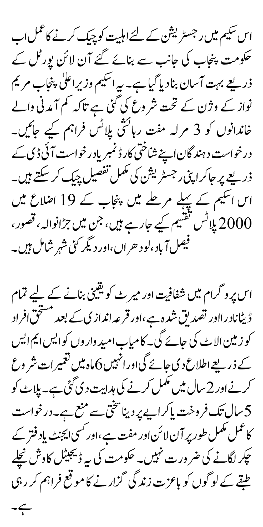 اس سکیم میں رجسٹریشن کے لئے اہلیت کو چیک کرنے کا عمل اب حکومت پنجاب کی جانب سے بنائے گئے آن لائن پورٹل کے ذریعے بہت آسان بنا دیا گیا ہے۔ یہ اسکیم وزیراعلیٰ پنجاب مریم نواز کے وژن کے تحت شروع کی گئی ہے تاکہ کم آمدنی والے خاندانوں کو 3 مرلہ مفت رہائشی پلاٹس فراہم کیے جائیں۔ درخواست دہندگان اپنے شناختی کارڈ نمبر یا درخواست آئی ڈی کے ذریعے پر جاکر اپنی رجسٹریشن کی مکمل تفصیل چیک کر سکتے ہیں۔ اس اسکیم کے پہلے مرحلے میں پنجاب کے 19 اضلاع میں 2000 پلاٹس تقسیم کیے جا رہے ہیں، جن میں جڑانوالہ، قصور، فیصل آباد، لودھراں، اور دیگر کئی شہر شامل ہیں۔