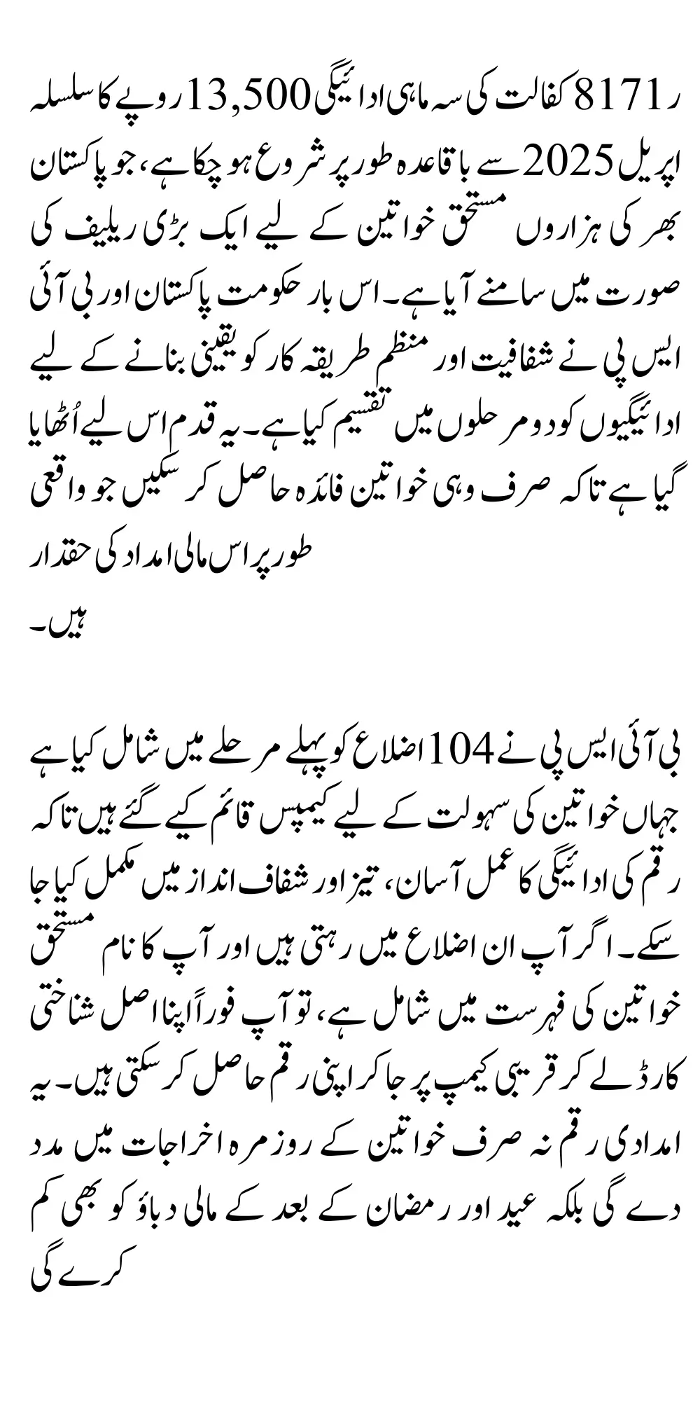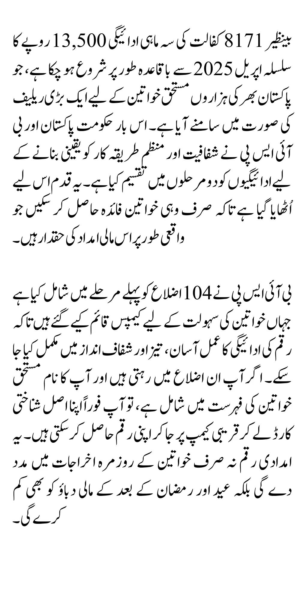 The Benazir 8171 Kafalat Payments Quarterly 13500 is more than just a financial aid package. It is a lifeline for thousands of women who depend on it to cover essential expenses like food, children’s school fees, healthcare, and utilities. The April 2025 round is especially important as it comes after Ramadan and Eid when families often face higher financial pressures.