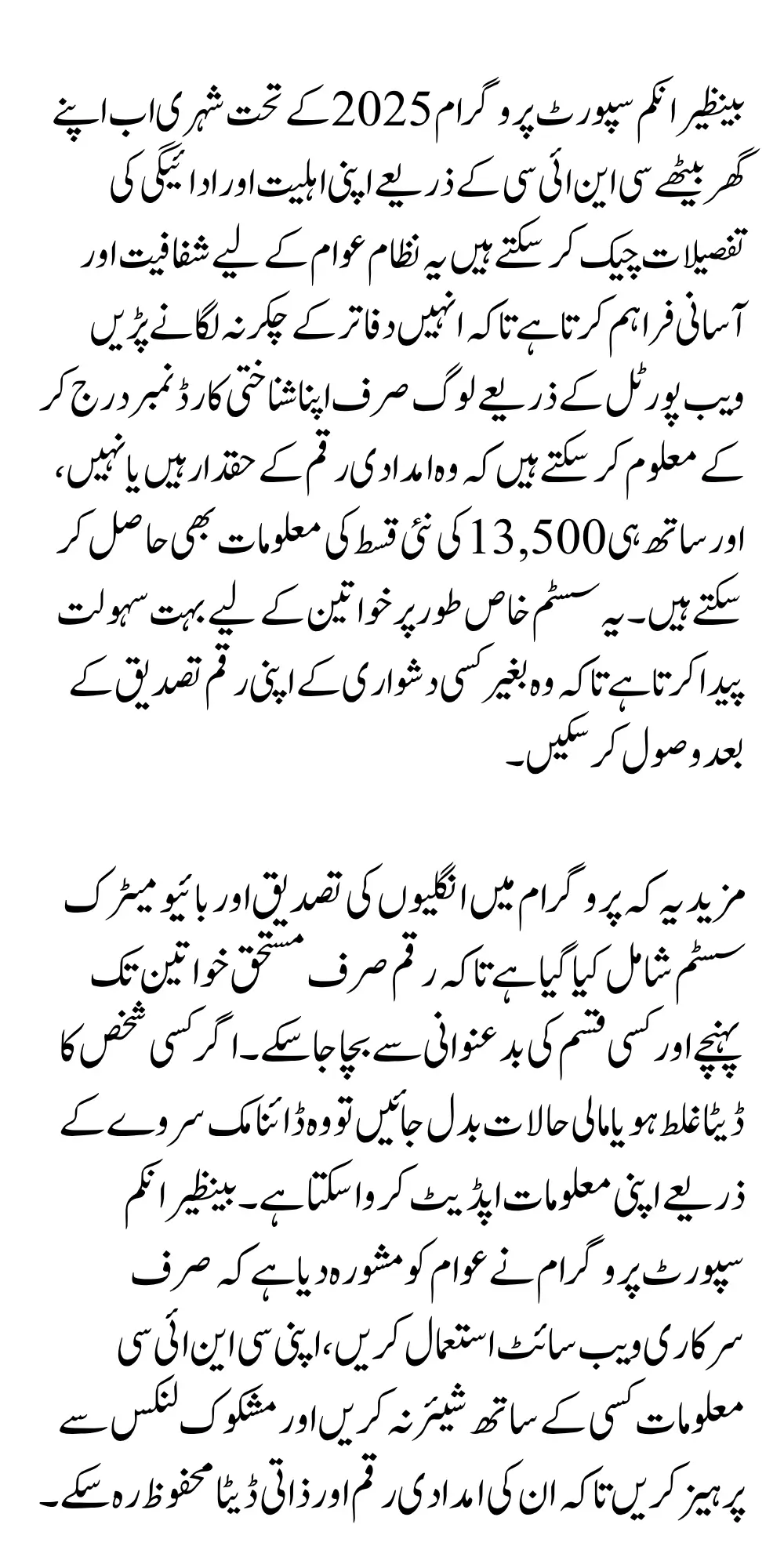 The Benazir Income Support Programme has urged all beneficiaries to stay alert against fake messages and fraudulent links. Only the official portal should be used for CNIC verification and payment status checking. Users are also advised to avoid entering their CNIC on any website that is not managed by the government.