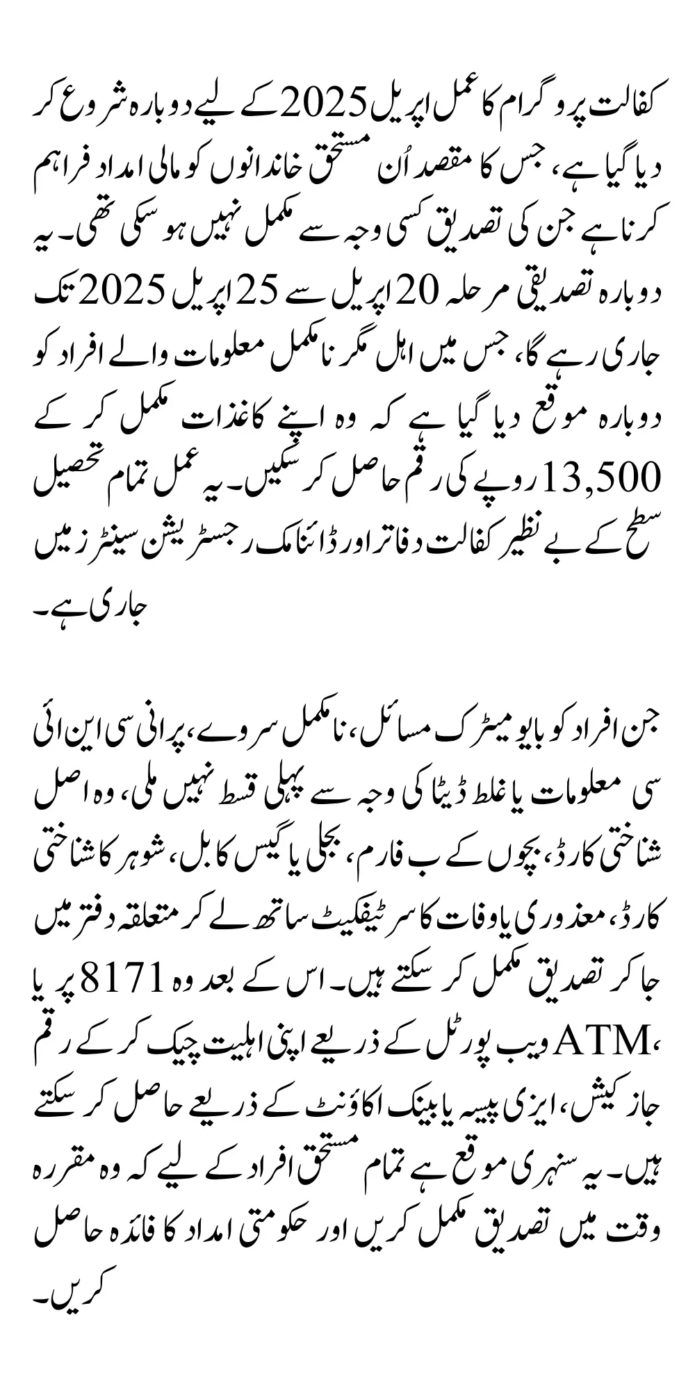 Benazir Kafalat 13500 Payment 8171 Reverification process has been resumed for April 2025, with the aim of providing financial assistance to those deserving families whose verification could not be completed for some reason. This re-verification phase will continue from April 20 to April 25, 2025, in which eligible but incomplete information has been given a second chance to complete their documents and receive an amount of Rs. 13,500. This process is ongoing at all tehsil-level BISP offices and Survey Centers.