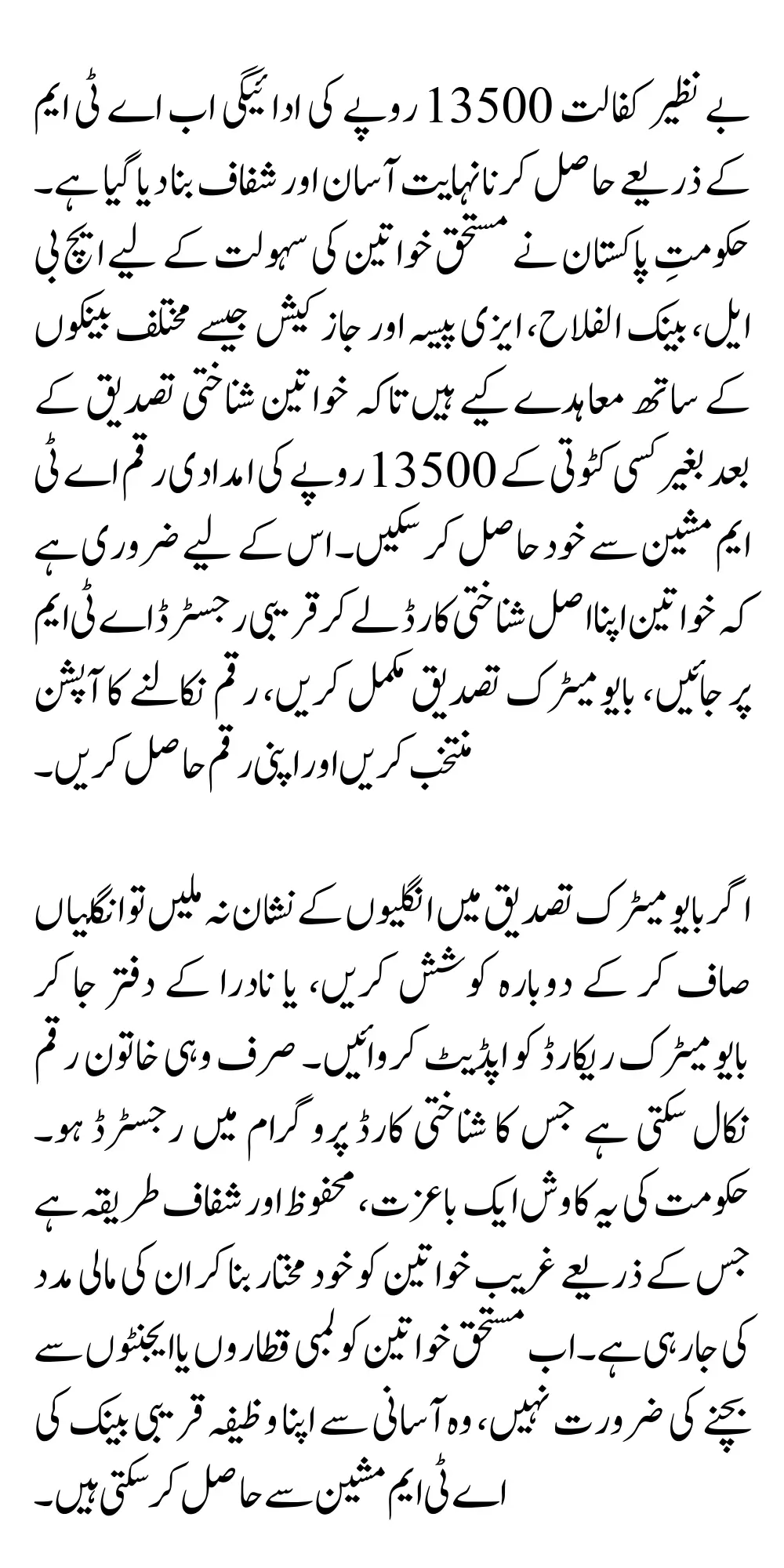 Before receiving the money, it is necessary that you verify your eligibility by sending your Identity Card number to 8171. If the fingerprints do not match in the biometric verification, then clean your fingers and try again or go to the Nadra office and update the biometric record. Only the woman whose Identity Card is registered in the program can withdraw the money. This government initiative is an excellent effort to provide financial assistance to poor women in a dignified, safe, and transparent manner so that they can access their money independently.