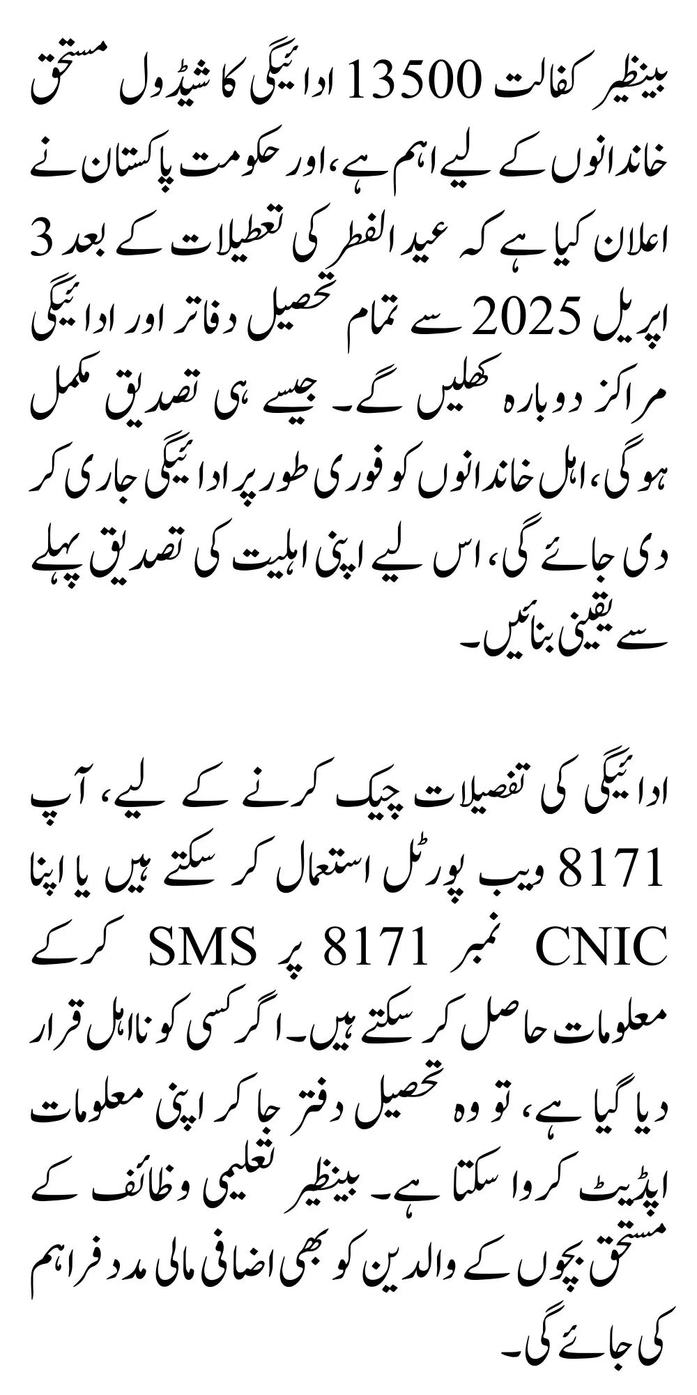 To check the payment details, you can use the 8171 web portal or get the information by SMSing your CNIC number to 8171. If someone has been declared ineligible, they can visit the Tehsil office and get their information updated. Additional financial assistance will also be provided to the parents of children eligible for Benazir Taleemi Wazaif.