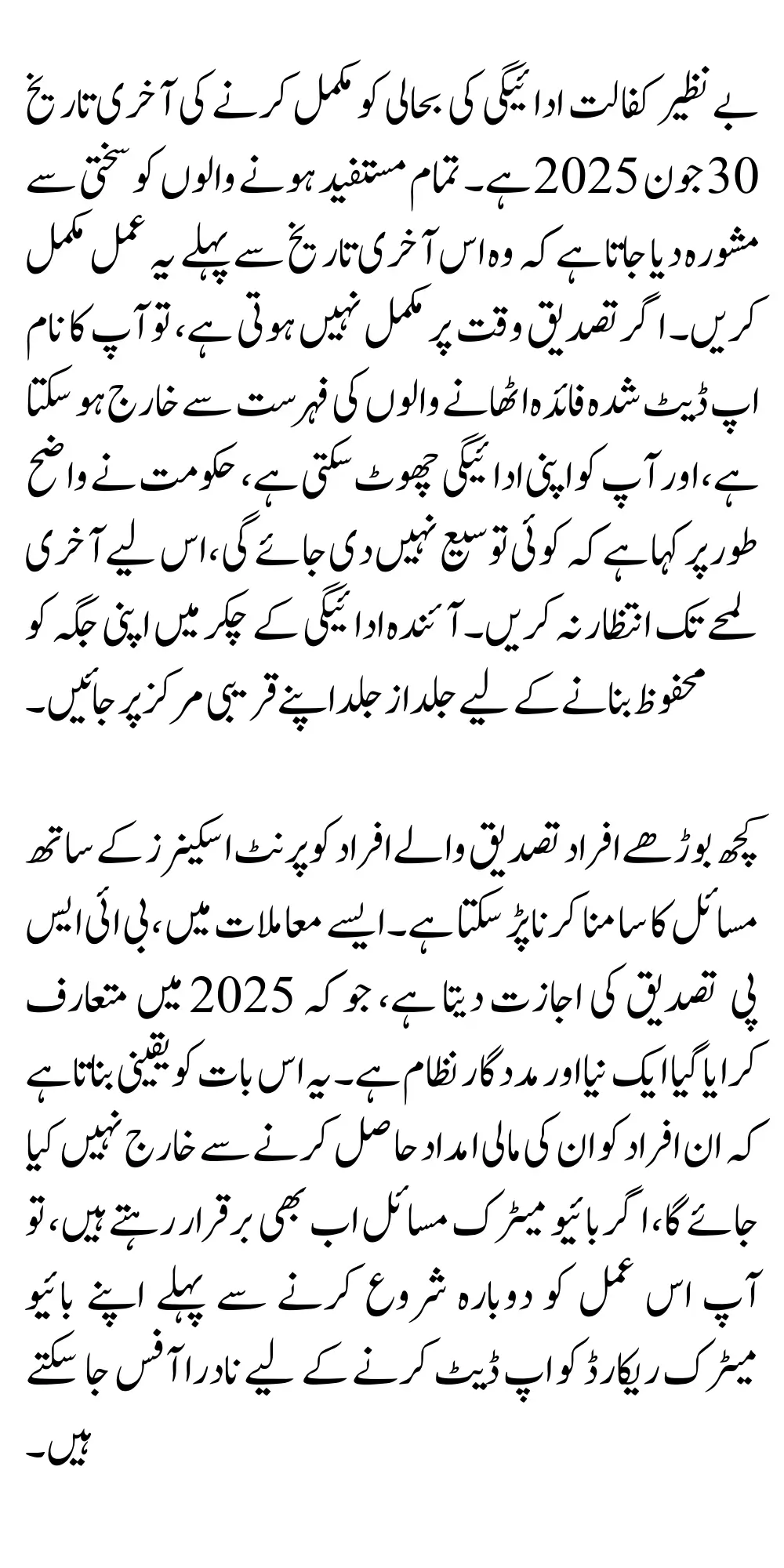 اس عمل کی آخری تاریخ 30 جون 2025 مقرر کی گئی ہے، اور اس کے بعد کسی بھی قسم کی توسیع کا امکان نہیں ہے۔ کامیاب تصدیق کے بعد، اہل افراد کو بذریعہ 8171 ایس ایم ایس اطلاع دی جائے گی اور وہ نیا 13500 روپے کا وظیفہ بینک اکاؤنٹ، جاز کیش موبائل والیٹ یا قریبی ادائیگی مراکز سے حاصل کر سکیں گے