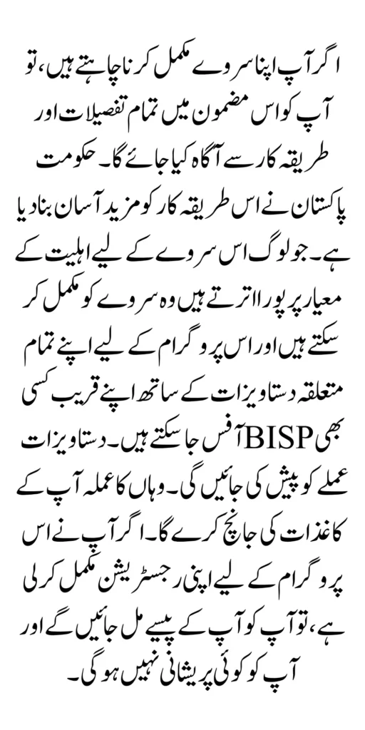 If you want to complete your survey, then you will be informed about all the details and procedures in this article. The government of Pakistan has made this method more simple. Those who meet the eligibility criteria for this survey can complete the survey and visit any PISP office near you with all their relevant documents for this program. The documents will be presented to the staff. The staff there will check your documents. If you have completed your registration for this program, you will receive your money and you will not have any problems.