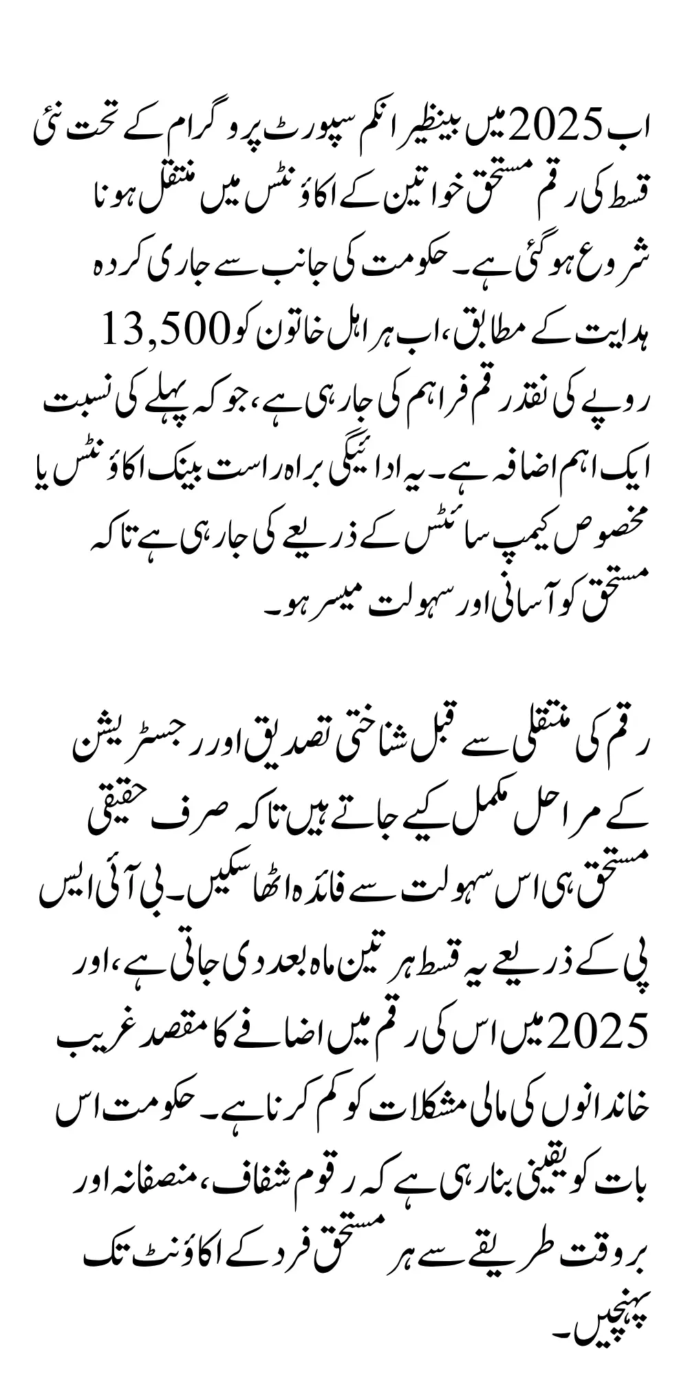 Now, in 2025, the new installment of money under the Benazir Income Support Program has started transferring to the accounts of deserving women. As per the instructions issued by the government, now every eligible woman is being provided with a cash amount of Rs. 13,500 which is a significant increase compared to earlier. This payment is being made directly through bank accounts or through designated campsites to provide ease and convenience to the deserving.