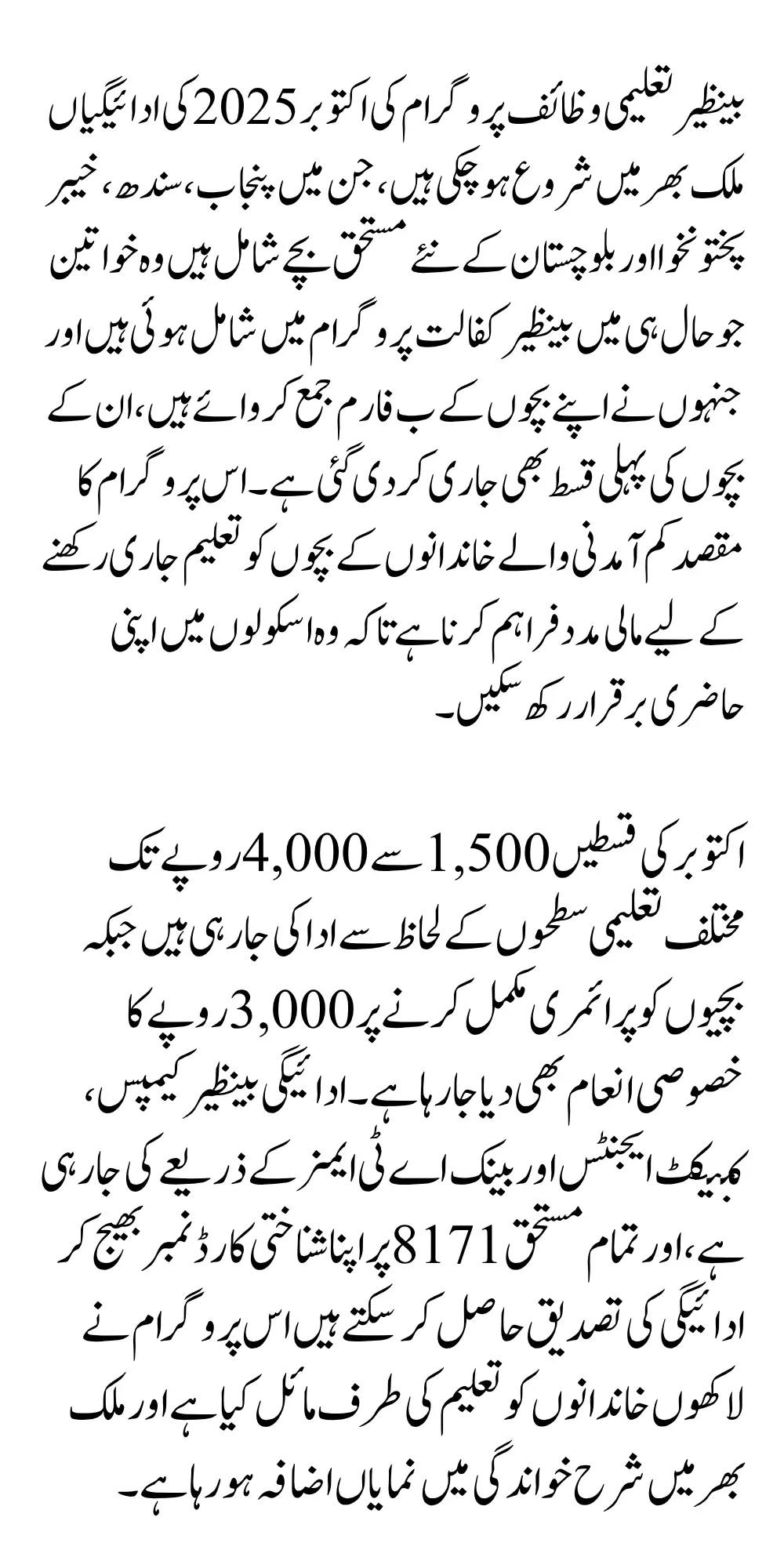 | Program | Benazir Taleemi Wazaif — October 2025 payments under BISP |
