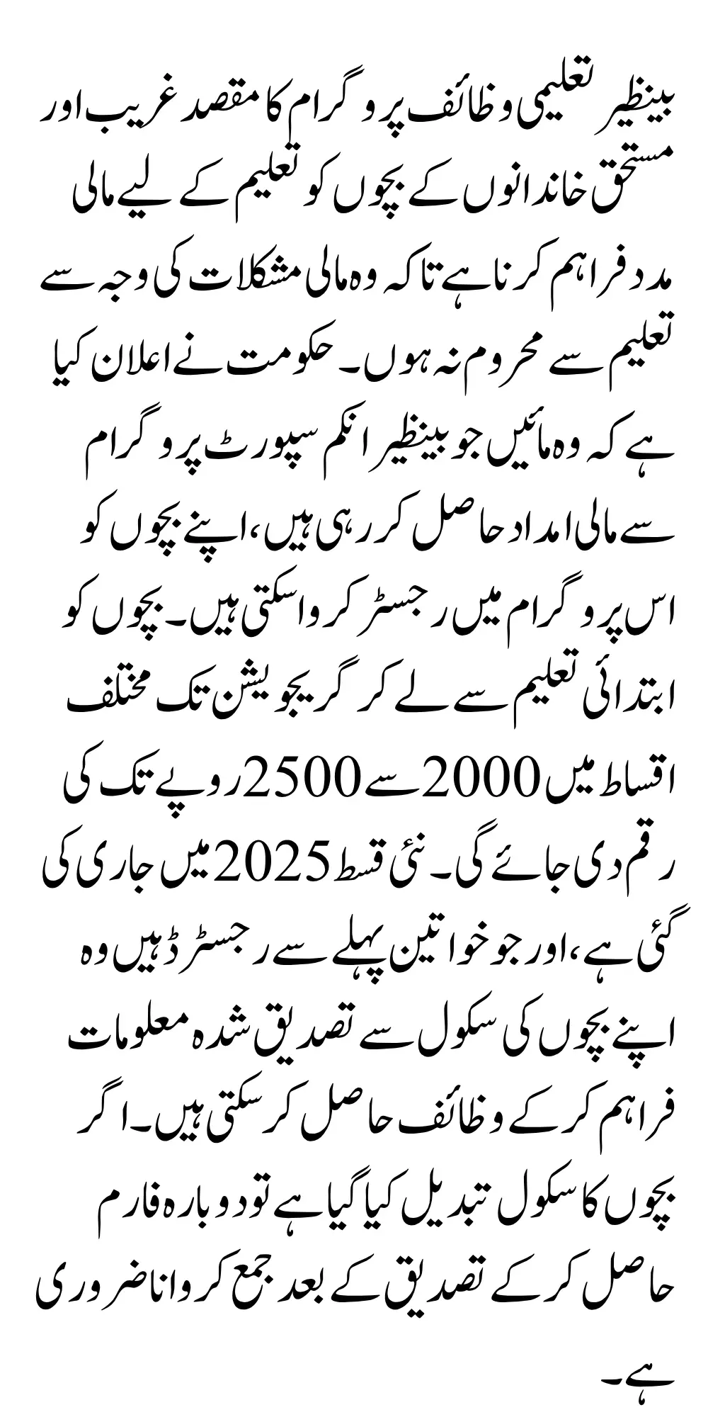 Now mothers who are receiving assistance from the Benazir Income Support Program can register their children for the Wazaif. Now your children will be given 2000 to 4000 thousand rupees under the Benazir Income Support Program and Taleemi Wazaif.