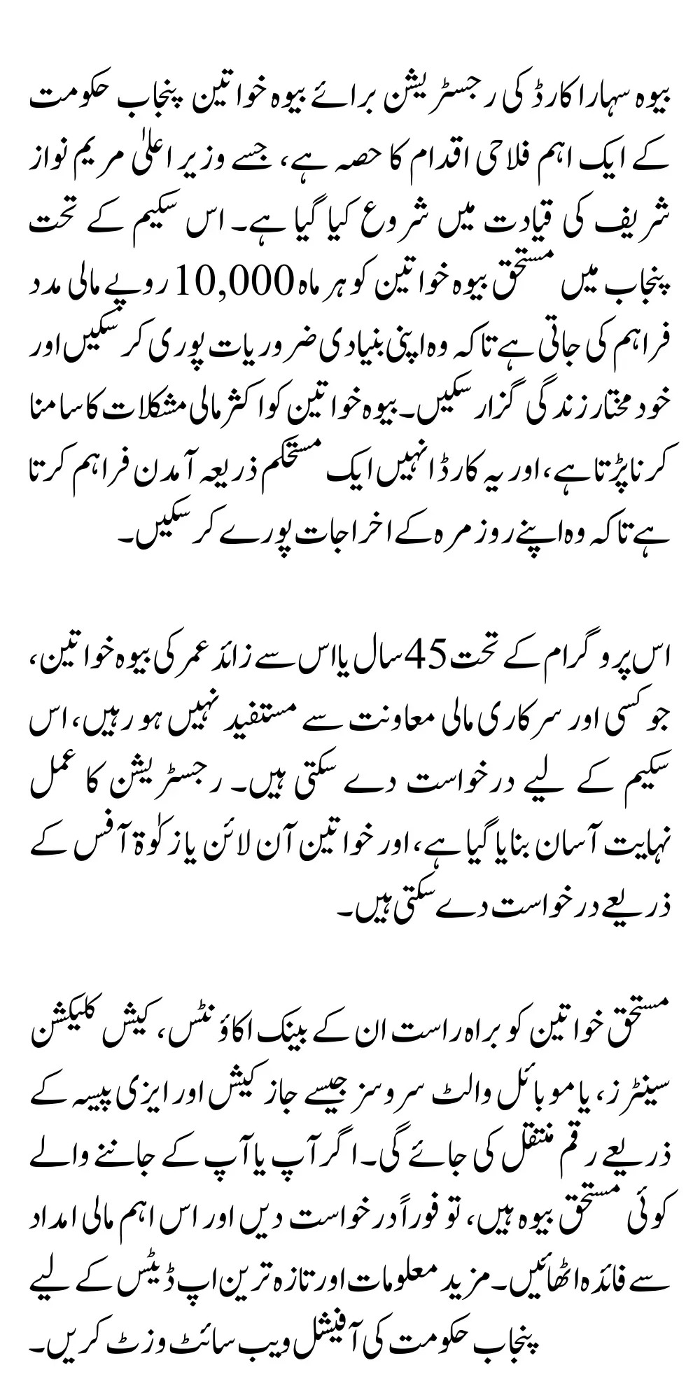 Widowed women aged 45 years or above, who are residents of Punjab and do not receive financial aid from other government programs, are eligible to apply.