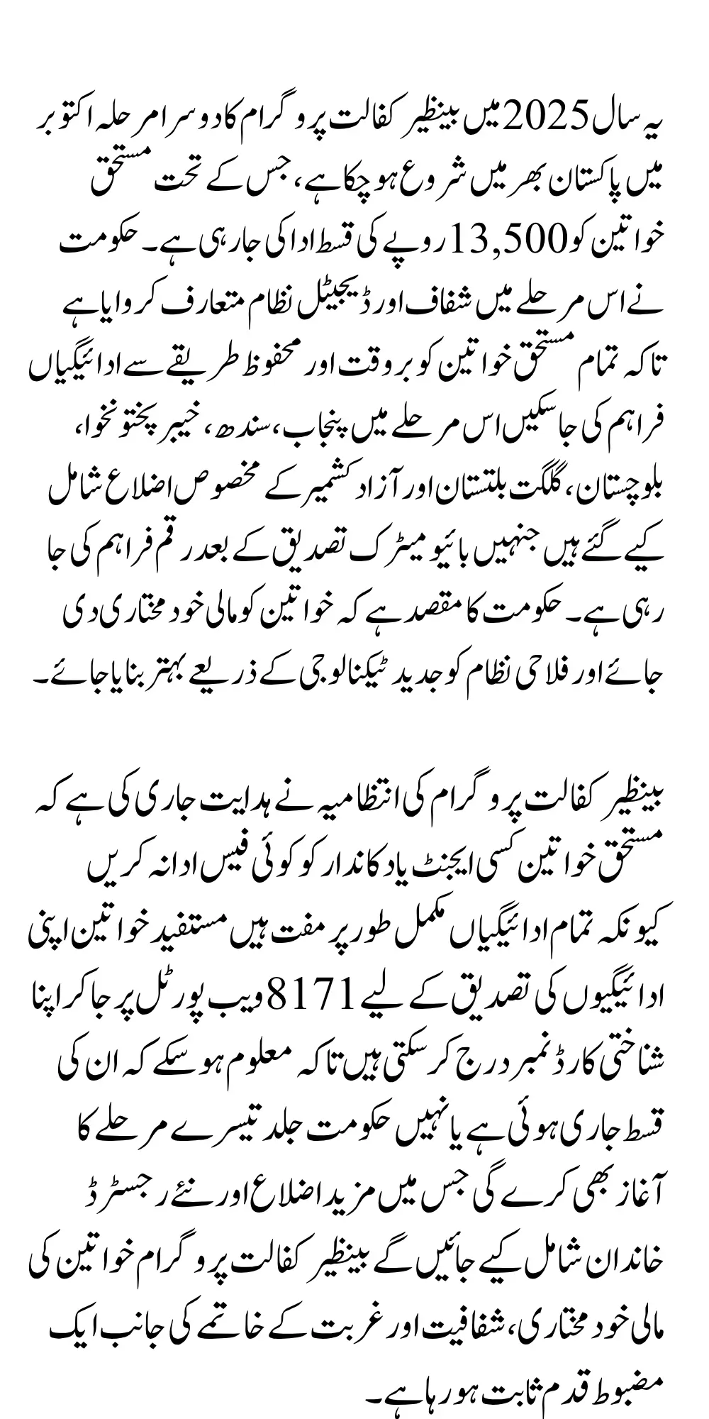 Benazir Kafalat 2025 second phase marks another major milestone in Pakistan’s social welfare journey by combining technology with public service, the government is making sure that all registered women receive their 13500 payments safely and on time transparent structure of this program has improved trust among beneficiaries and encouraged more households to participate in the system. Digital verification and real-time monitoring are transforming how financial assistance reaches families in need.