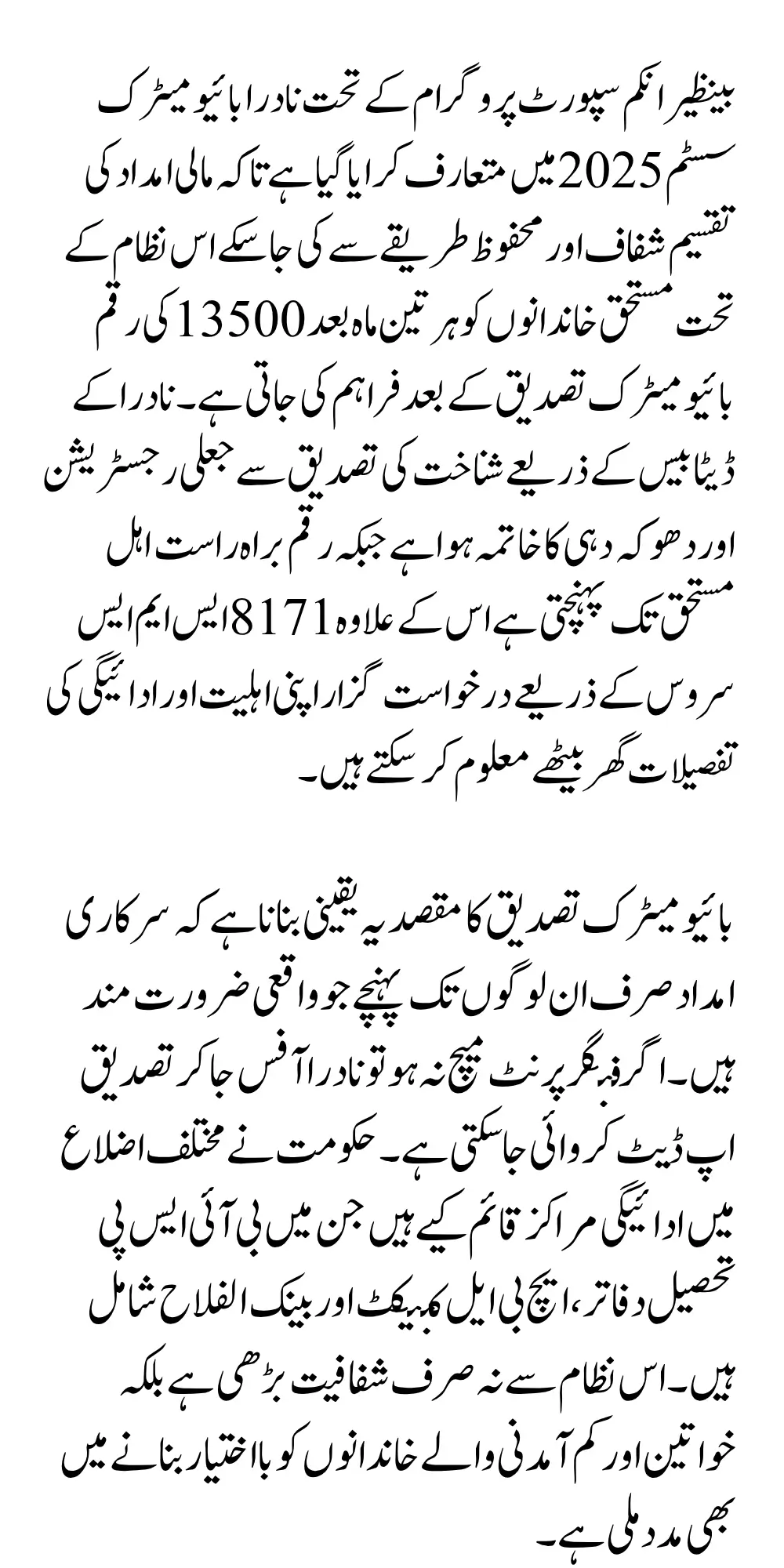 BISP 8171 NADRA Biometric is a major advancement toward transparent and efficient welfare delivery in Pakistan it ensures that 13500 quarterly payments reach genuine families without interference or fraud by combining Nadra biometric system with digital technology the government has made the process secure and convenient beneficiaries are encouraged to verify their details keep their documents ready and follow official guidelines to receive their payments smoothly and on time.