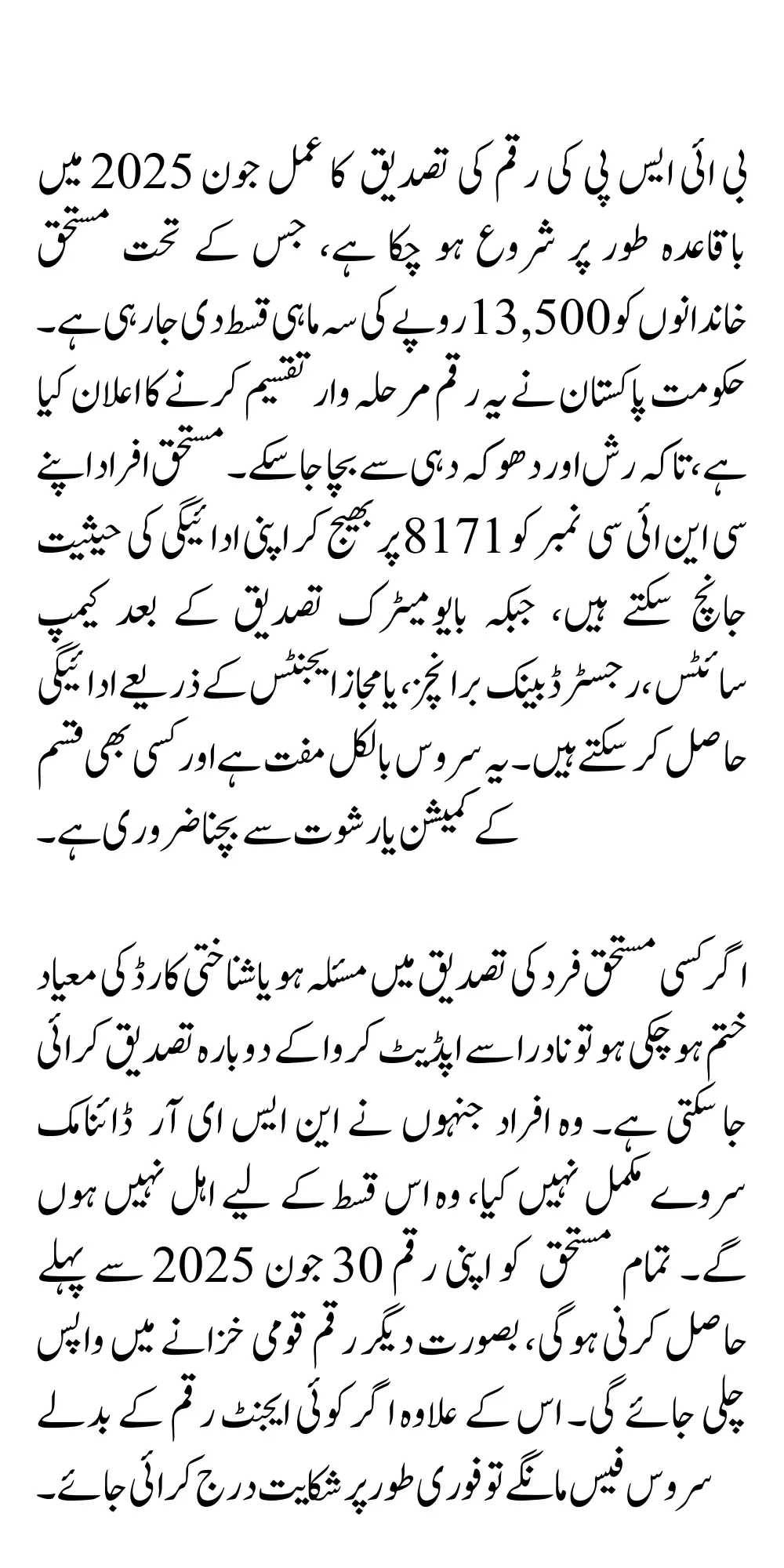 ensure their CNIC and biometric data is updated, and collect their payment through official channels before June 30 Stay safe, avoid fraud, and share this information with others who may benefit. For more help, always reach out through the official BISP helpline at 0800-26477 or visit your nearest BISP office.
