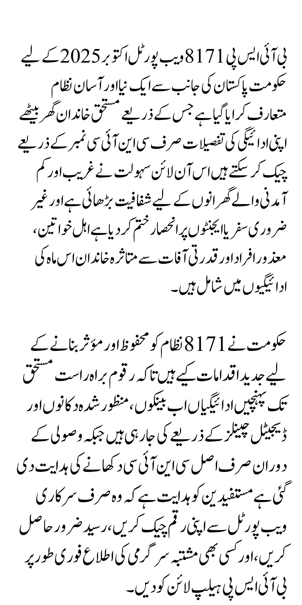8171 payment distribution system has been improved to offer beneficiaries safer and more convenient access to funds families no longer have to wait in long lines or depend on middlemen to receive their money Payments are now being processed through banks, authorized shops, and other official channels under the supervision of BISP.