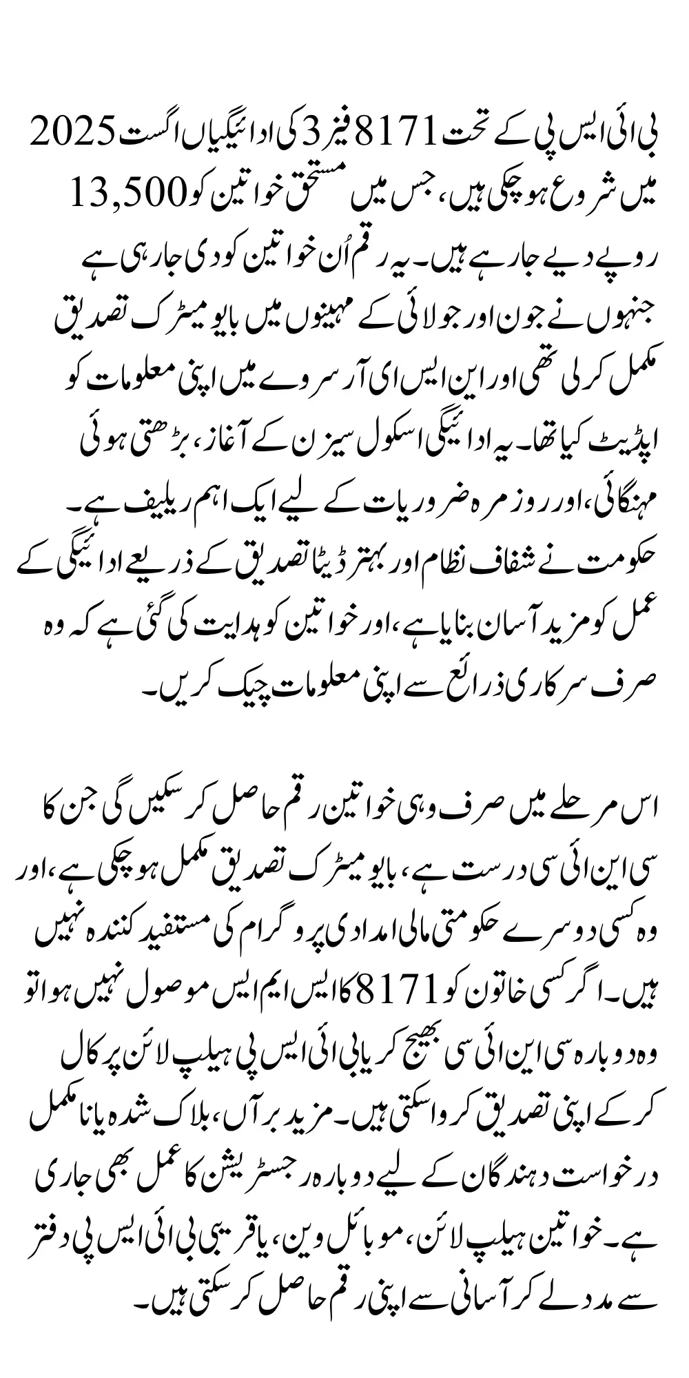 The BISP 8171 Phase 3 August 2025 installment is a timely initiative designed to provide support to those who need it most Verified women should act promptly to confirm their status and collect their Rs. 13,500 through official channels only.