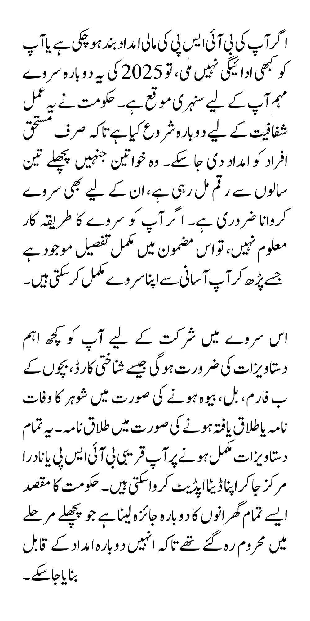 اگر آپ پہلے بے نظیر انکم سپورٹ پروگرام میں نااہل قرار دی گئی تھیں، تو اب 2025 کی دوبارہ سروے مہم میں شامل ہونا آپ کے لیے ایک اہم موقع ہے۔ حکومت نے اس سروے کو خاص طور پر خواتین کے لیے آسان بنایا ہے، تاکہ بیوہ، طلاق یافتہ یا غریب خواتین دوبارہ رجسٹریشن کروا سکیں اور مالی امداد حاصل کر سکیں۔ اس عمل میں آپ کی معلومات کو جدید سسٹم کے ذریعے دوبارہ چیک کیا جائے گا۔