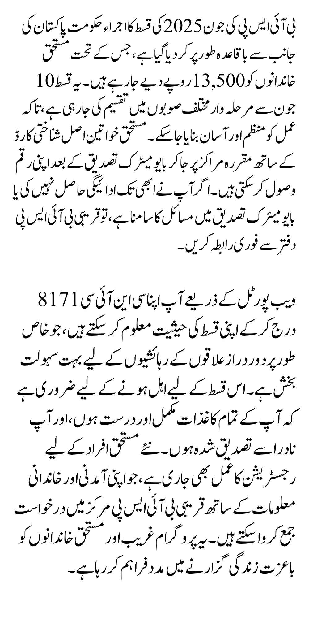 To reduce confusion and save time, BISP has made it easy for users to check their payment status online. Simply visit the 8171 web portal, enter your CNIC, and instantly view your payment status. This digital option is particularly useful for those living in remote areas.