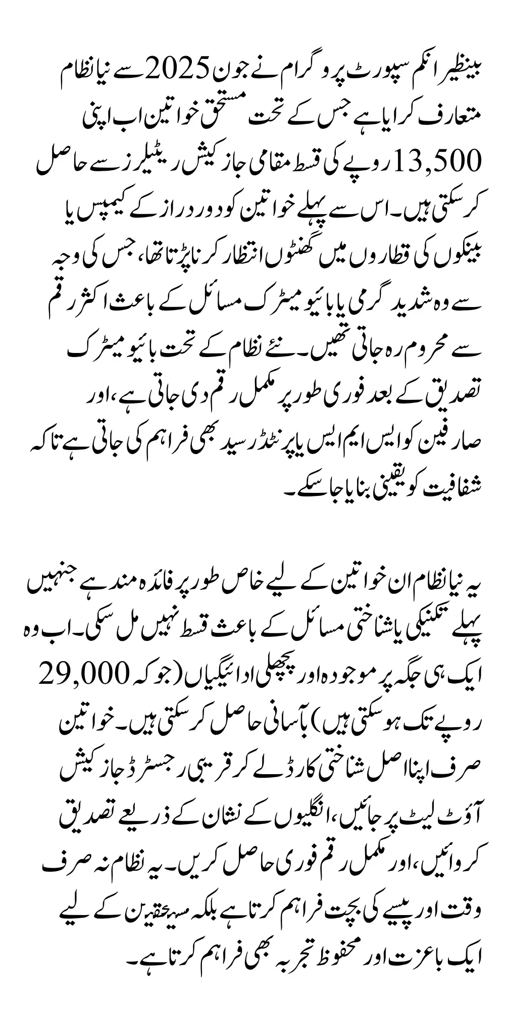 Under the updated process, beneficiaries are no longer required to travel to campsites or specific banks. Instead, they can visit a nearby JazzCash retailer registered with BISP, where trained agents handle the payment process using fingerprint verification. This makes the entire experience easier and quicker for eligible women.
