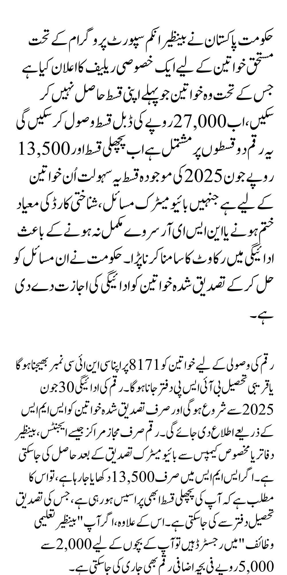 The total amount is PKR 27,000, split equally into two parts: the missed payment and the June 2025 payment. This decision was made to reduce the financial burden on families who were affected by delays due to technical problems or documentation issues.