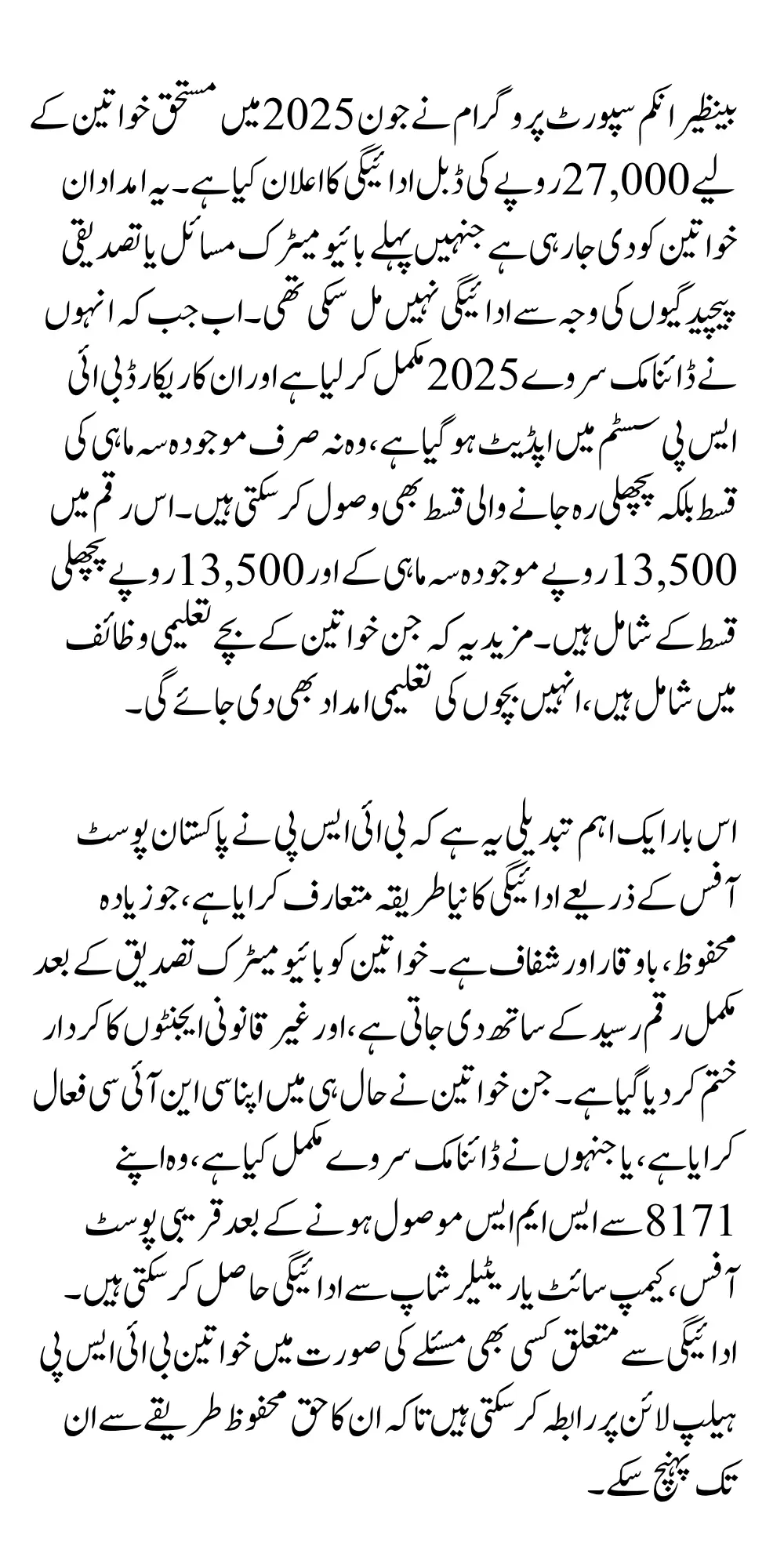 BISP 8171 June 2025: The Benazir Income Support Programme (BISP) continues to improve its support mechanisms for low-income families In June 2025, BISP 8171 is offering a double installment of Rs. 27,000 to eligible women who faced payment delays due to biometric mismatches or verification problems. This payment combines the current quarter and the missed installment, ensuring that no deserving woman is left without financial aid.