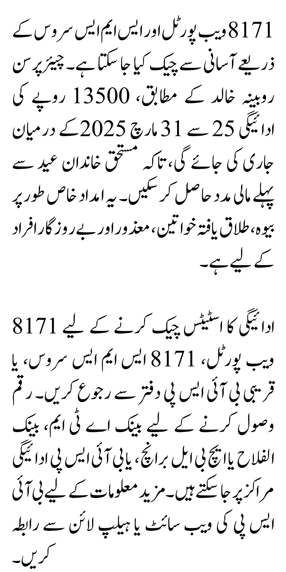 BISP Kafalat Payment 13500 Check Status can be easily checked through 8171 web portal and SMS service. According to Chairperson Rubina Khalid, the payment of Rs. 13500 will be released between 25 and 31 March 2025, so that the deserving families can get financial assistance before Eid. This assistance is especially for widows, divorced women, disabled and unemployed people.