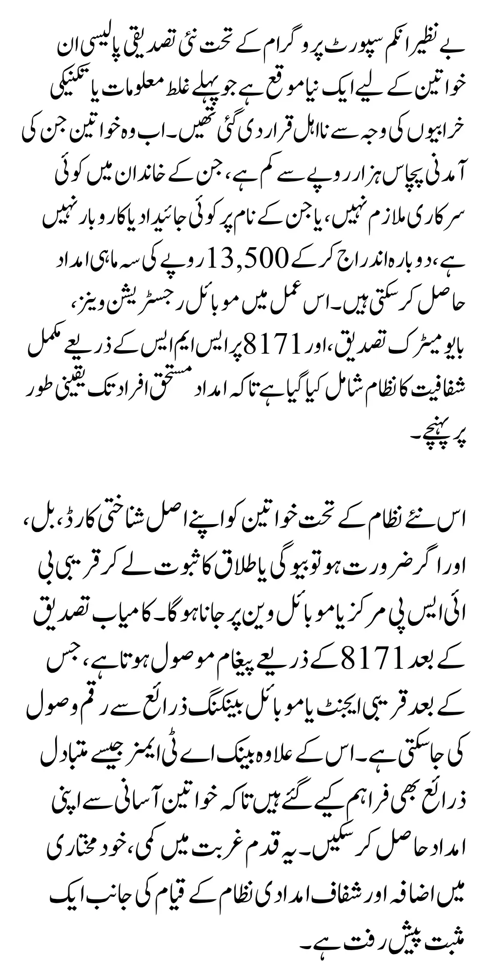 نئی تصدیقی پالیسی کے تحت خواتین کو اپنا شناختی کارڈ، گھر کا بل، اور اگر ضروری ہو تو طلاق یا بیوگی کا سرٹیفکیٹ ساتھ لے کر قریبی بی ائی ایس پی دفتر یا موبائل وین پر جانا ہوگا۔ وہاں بایومیٹرک تصدیق اور کاغذات کی جانچ کے بعد 8171 پر ایک ایس ایم ایس کے ذریعے اطلاع دی جاتی ہے۔ کامیاب تصدیق کے بعد خواتین اپنے قریبی مرکز یا موبائل بینکنگ کے ذریعے ادائیگی وصول کر سکتی ہیں۔