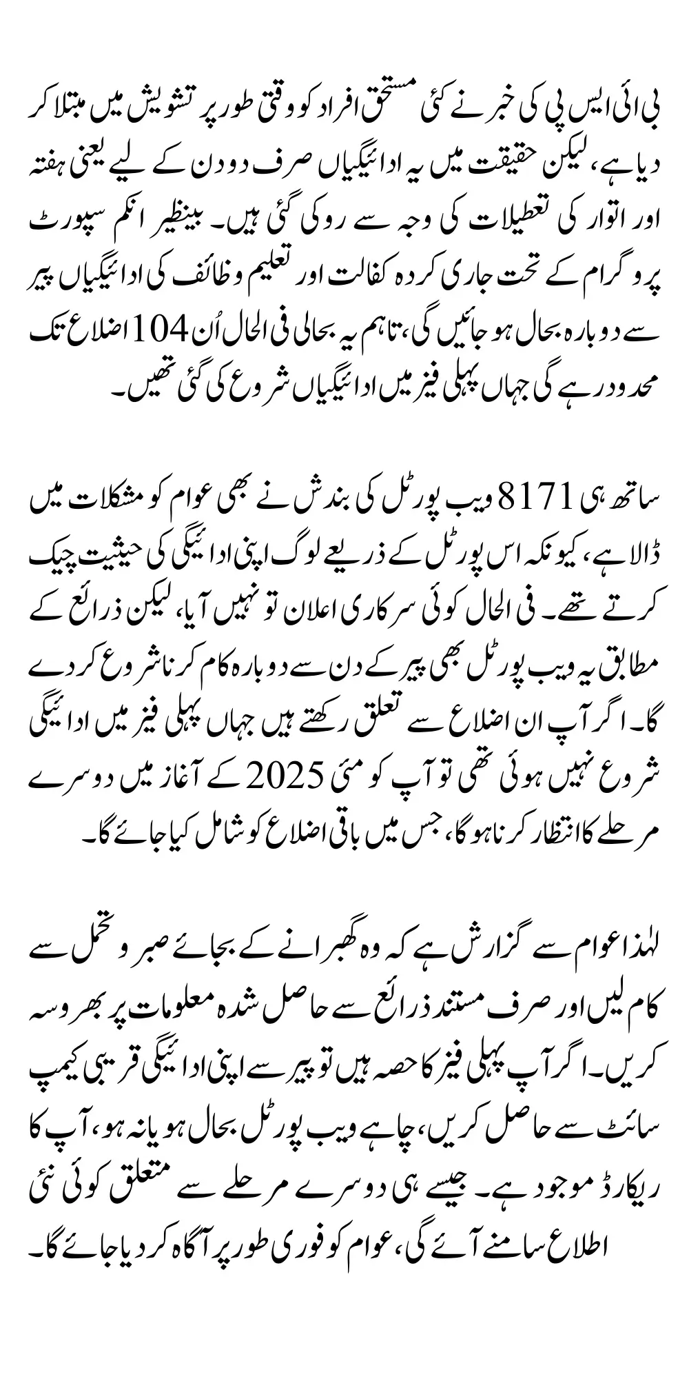 The temporary suspension of BISP payments under the Kafalat and Taleemi Wazaif programs has caused some confusion among eligible families. But the reason behind this is simple—weekend holidays. There is no need to panic. Payments will resume from Monday in all first-phase districts The 8171 web portal is also currently down but is expected to be operational again soon. Those from the second phase districts should remain patient, as their turn is expected to come in May 2025.
