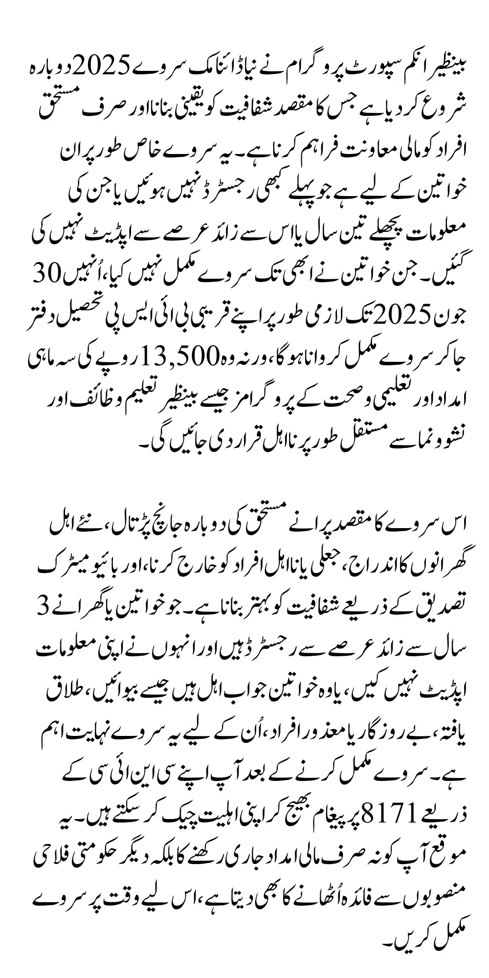 To protect your benefits and unlock new opportunities like education support and health schemes, visit your nearest BISP office with all required documents. Complete your biometric verification, and confirm your status via 8171 Don’t delay this is your family’s chance to maintain essential financial support.