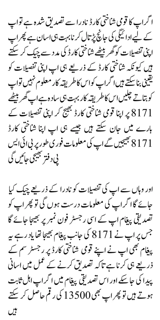 And from there, your details will be checked by NADRA. If your information is correct, then a confirmation message will be sent to your registered phone number on which you sent the message to 8171. Remember, this message also has to be sent through the SIM registered on your National Identity Card so that the verification process can be facilitated. And if you are found eligible in this confirmation message, then you can also get the amount of 13500.