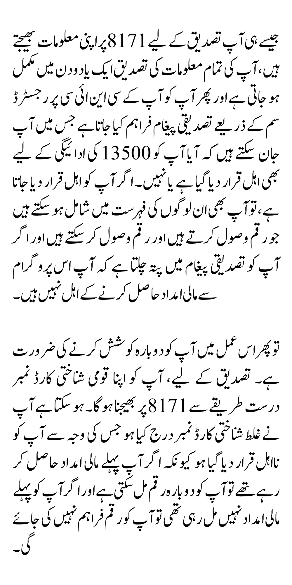 As soon as you send your information to 8171 for verification, the verification of all your information is completed within a day or two and then you are provided with a confirmation message through the registered SIM on your CNIC in which you can know whether you have also been declared eligible for the payment of 13500 or not. If you are declared eligible, then you can also be included in the list of those who receive the money and can receive the money and if you find out in the confirmation message that you are not eligible to receive financial assistance from this program.