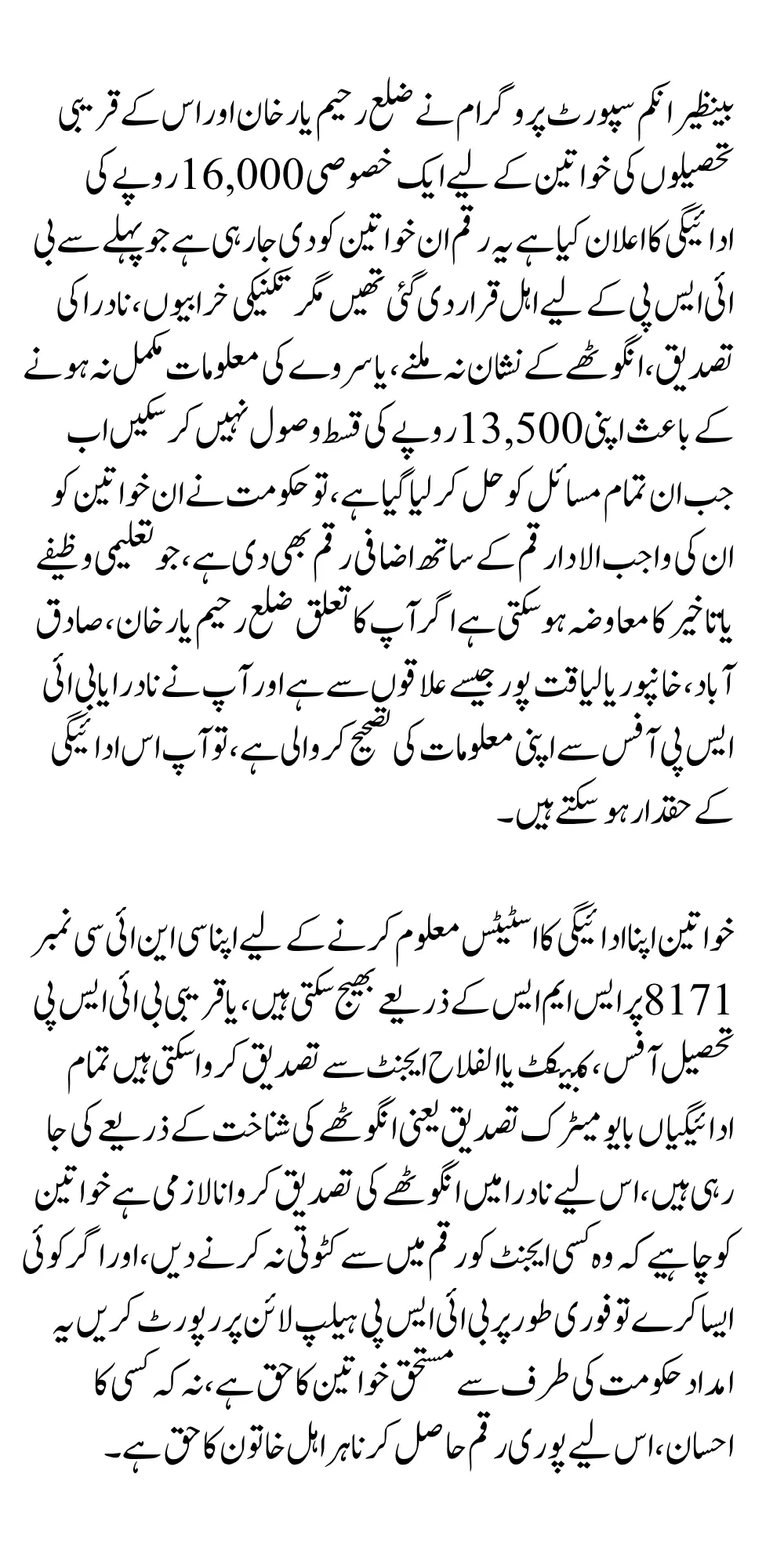BISP Rahim Yar Khan Rs. 16,000 Payment Summary