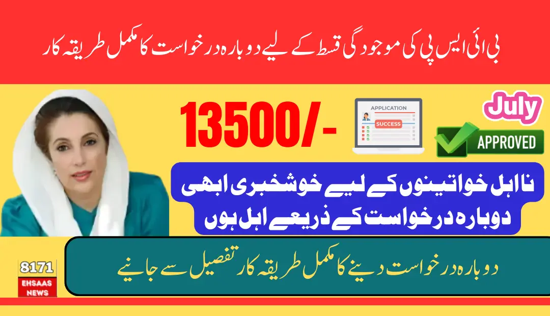 موجودہ 13500 جولائی کی ادائیگی کے لیے بی آئی ایس پی کی دوبارہ درخواست: بے نظیر انکم سپورٹ پروگرام ایک بار پھر اپنے 2025 کی دوبارہ درخواست کے اقدام کے ذریعے پاکستان بھر میں ہزاروں خواتین کے لیے اپنے دروازے کھول رہا ہے جو بیواؤں، معذور خواتین، اور کم آمدنی والے خاندانوں کی خواتین کی مدد کے لیے ڈیزائن کیا گیا ہے، جولائی 2025 کے نظام کے لیے جو دوسرے مرحلے میں غلطی کی وجہ سے پیش کش کی گئی تھی، ان کے لیے دوسرے مرحلے کی غلطی تھی۔ یا رسائی کی حدود۔