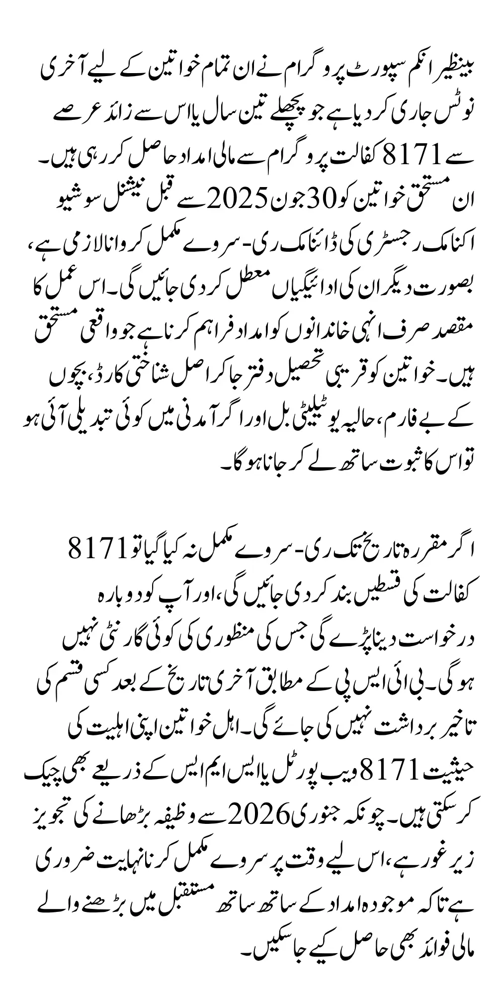 Any recipient who has been part of the BISP 8171 Kafalat Program for more than three years is required to complete this re-survey. The system has flagged these accounts for re-verification, especially if there has been a change in household size, income, or dependency. Notifications have also been sent via 8171 SMS to eligible women.