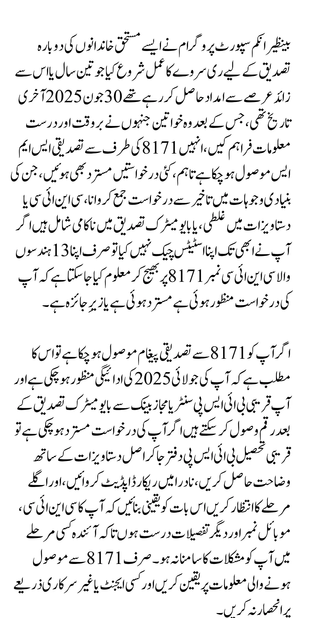 If you received a confirmation SMS from 8171, your BISP July 2025 payment is confirmed. Only those who successfully completed the re-survey before June 30, 2025, and passed biometric verification will receive payments in this cycle Applicants who missed the deadline or had incorrect documents will not get paid this time but may be eligible for future cycles.