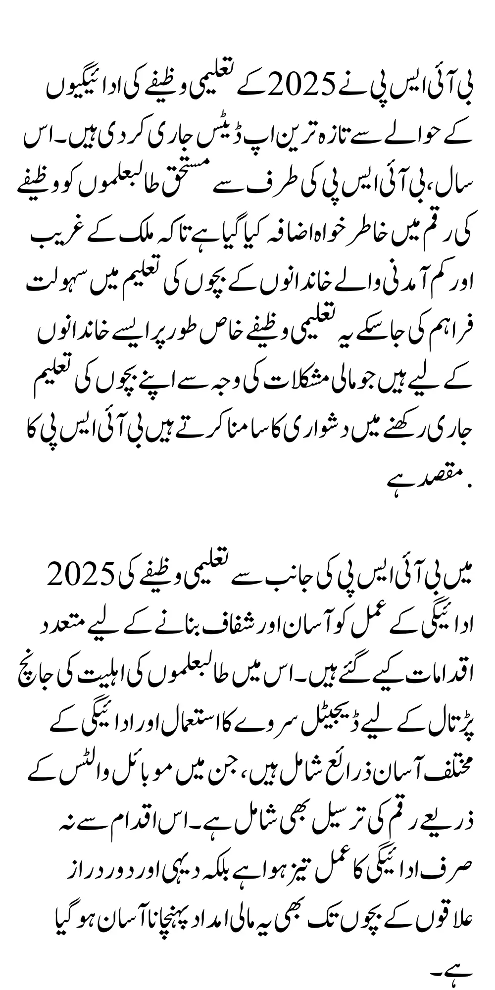 In 2025, BISP has taken several steps to make the education scholarship payment process easier and more transparent this includes the use of digital surveys to check the eligibility of students and various convenient payment channels including money transfer through mobile wallets this step has not only expedited the payment process but also made it easier to reach children in rural and remote areas.