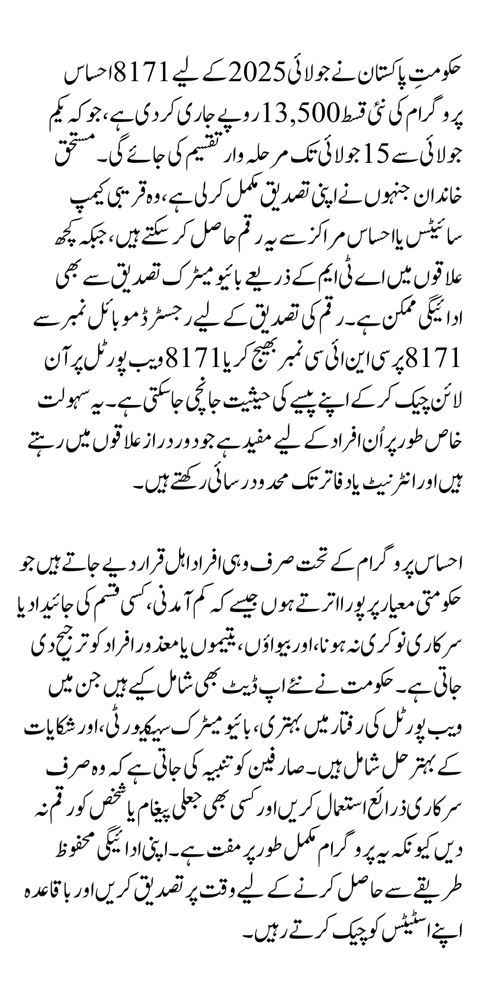 Check Current Release Qist For 8171 Ehsaas Program July 2025 Qist of Rs. 13,500 has been officially launched to support financially vulnerable families across Pakistan The payment is part of the government’s continuous effort to provide timely financial aid to those in need. With the rising cost of basic necessities, this installment will help thousands of families manage their household expenses.