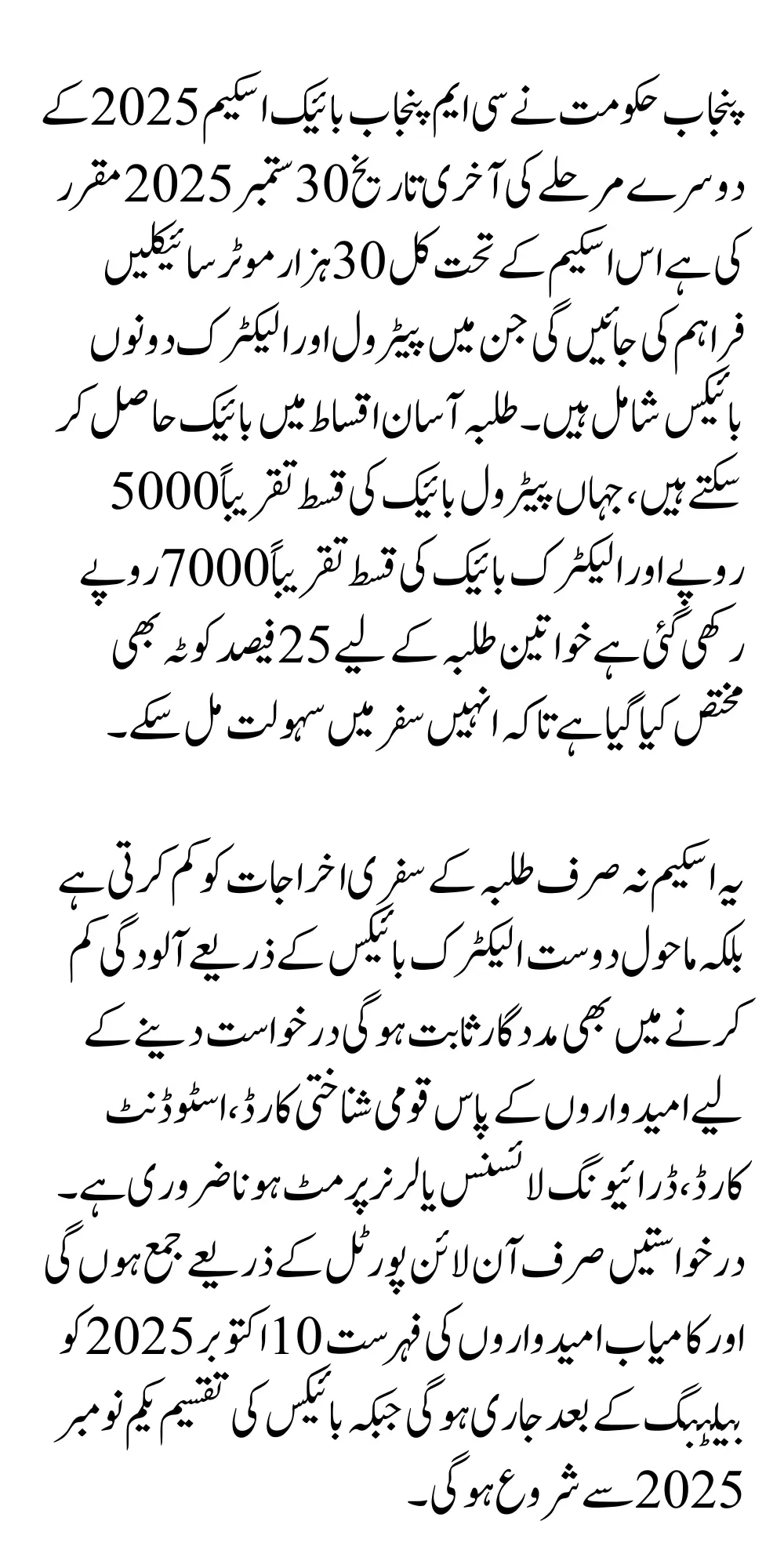In this phase, the Punjab government has announced the official last date for online applications Students who wish to benefit from this scheme must apply before 30th September 2025 the program has been designed to ease commuting problems, reduce transport expenses, and promote eco-friendly solutions through electric bikes it also offers easy installment plans, making it more accessible for thousands of students across the province.