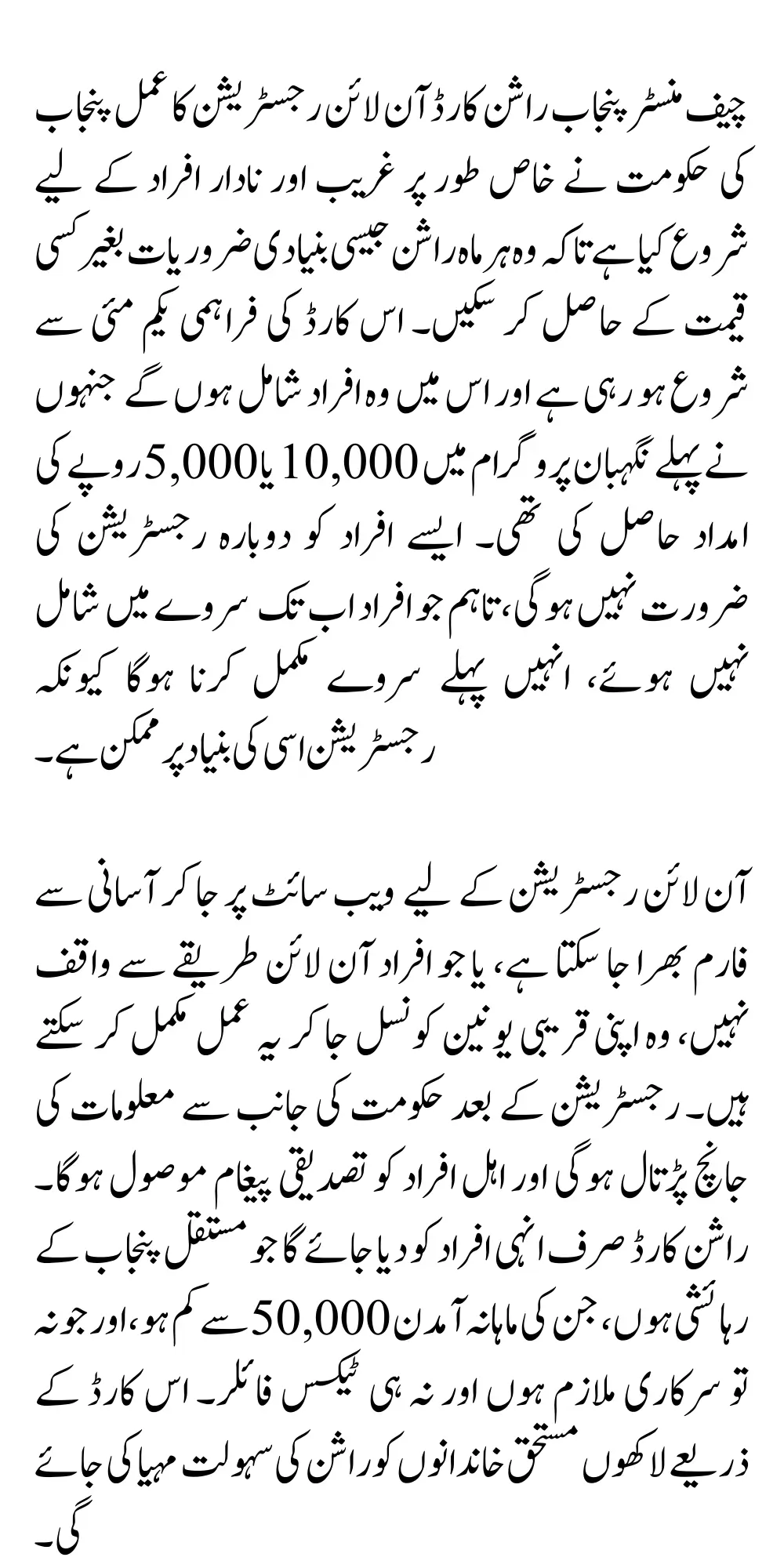 For online registration, the form can be easily filled by visiting the PSER website, or those who are not familiar with the online method can visit their nearest union council and complete this process. After registration, the government will verify the information and the eligible people will receive a confirmation message. Ration cards will be given only to those people who are permanent residents of Punjab, whose monthly income is less than 50,000, and who are neither government employees nor tax filers. Through this card, ration facility will be provided to lakhs of deserving families.