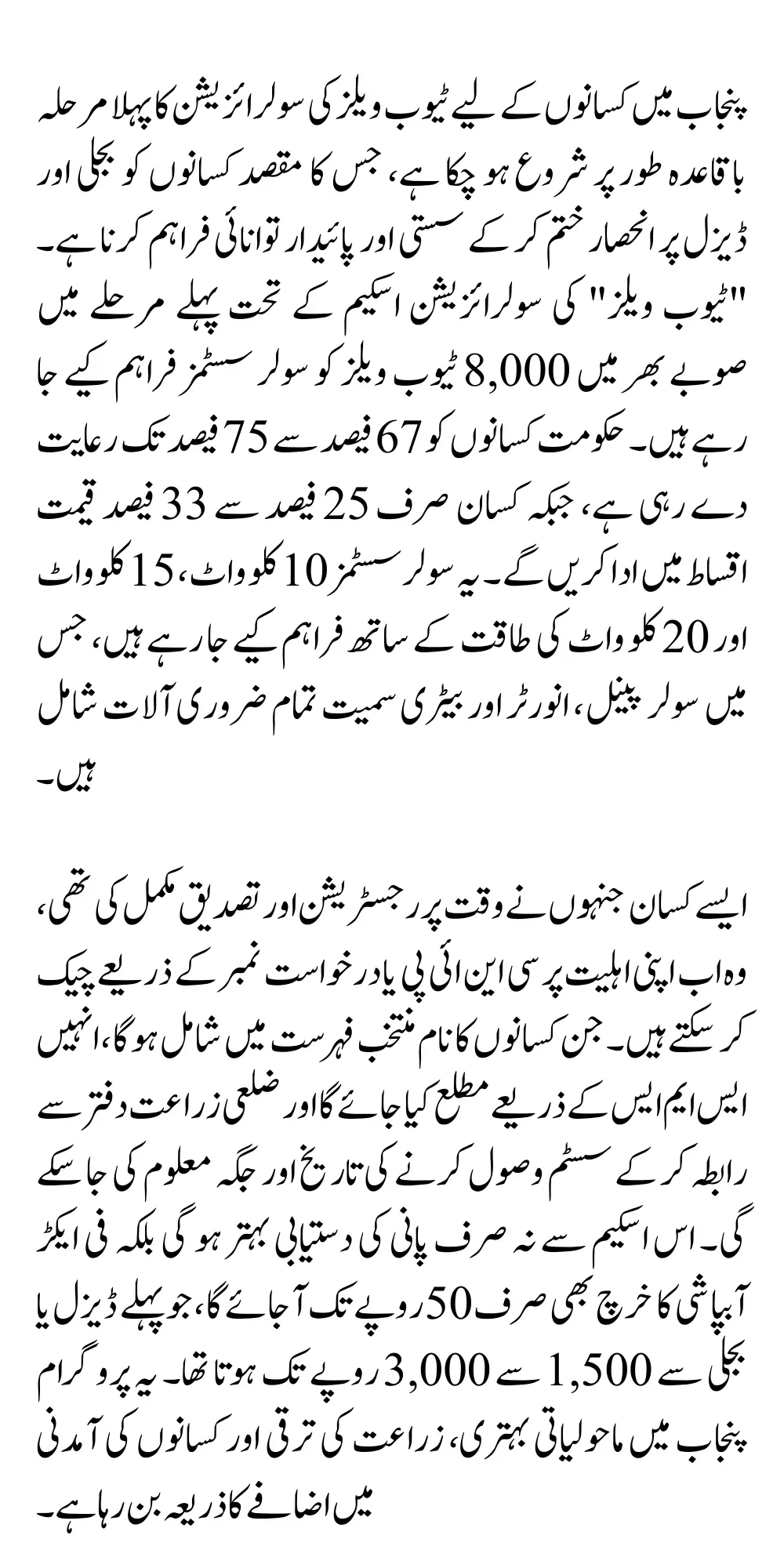 Whether you own a small piece of land or a large farm, this program is designed to support all kinds of farmers. With different system sizes available and easy payment options, the solarization of tube wells makes irrigation more manageable for everyone.